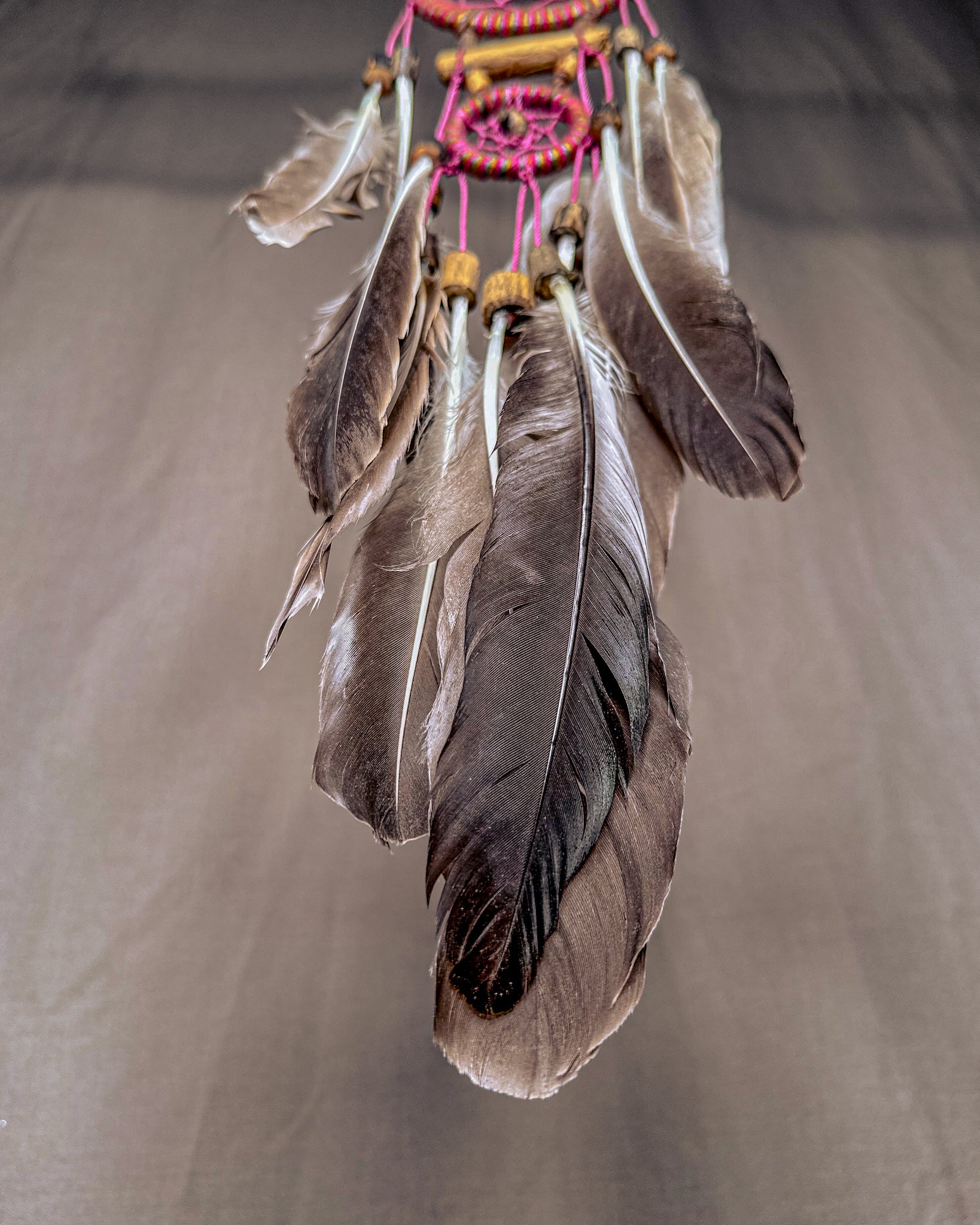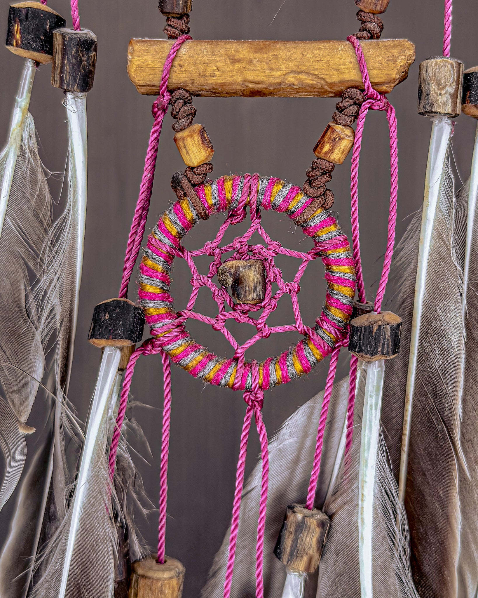 Rankų darbo, gyvų spalvų sapnų gaudyklė - „Flamingas“. Medienos detalės ir karoliukai formuojami iš Baltijos jūros nuskalautų šakų. Savos gamybos mediniai lankai, kurių tinklai pinami intuityviai, leidžiant jiems „susidėlioti“ natūraliai. Plunksnas renku iš skirtingų Lietuvos kampų, šioje naudojau žąsų, fazanų ir ančių.