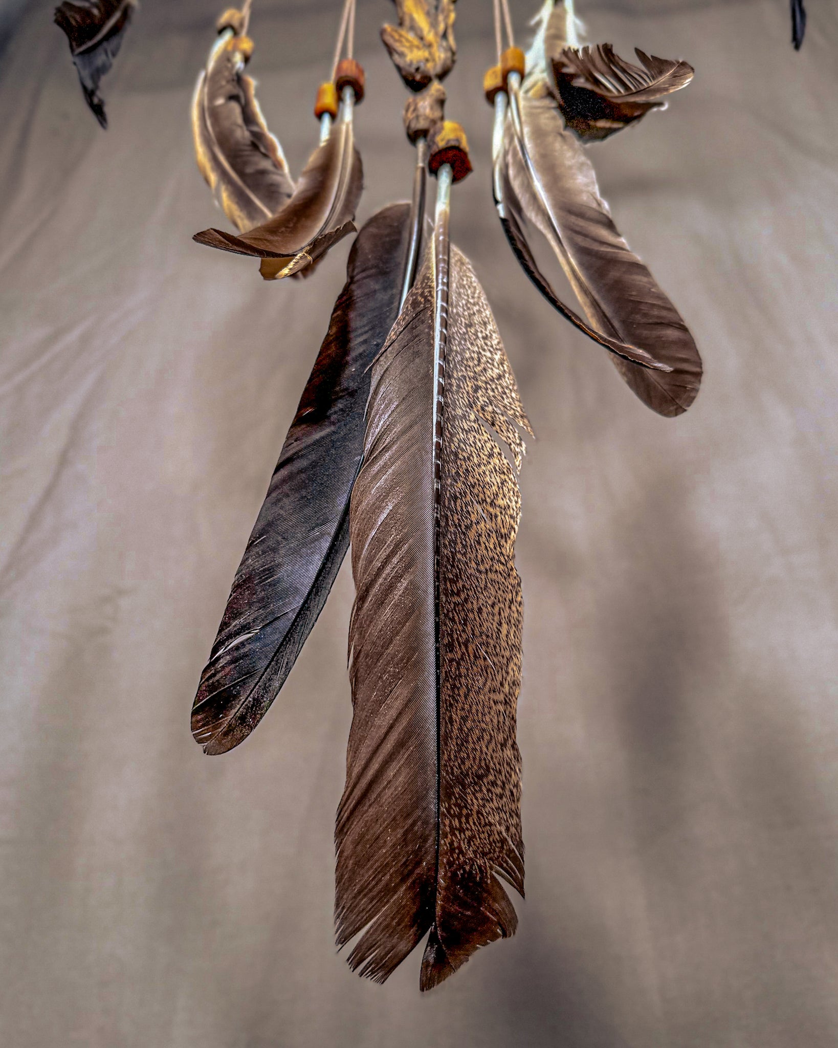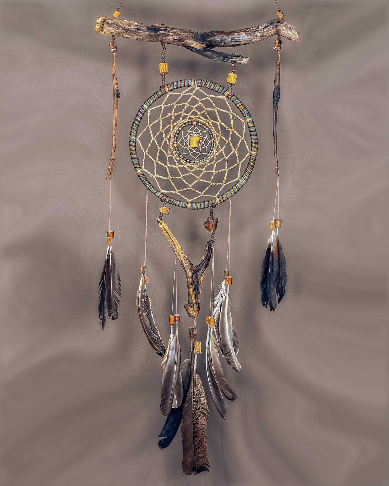 Rankų darbo, aura spinduliuojanti sapnų gaudyklė - „Koncentracija“. Medienos detalės ir karoliukai formuojami iš Baltijos jūros nuskalautų šakų. Savos gamybos mediniai lankai, kurių tinklai pinami iš kanapinės virvės, tai daroma intuityviai, leidžiant jai „susidėlioti“ natūraliai. Plunksnas renku iš skirtingų Lietuvos kampų, šioje naudojau žąsų ir kalakutų.
