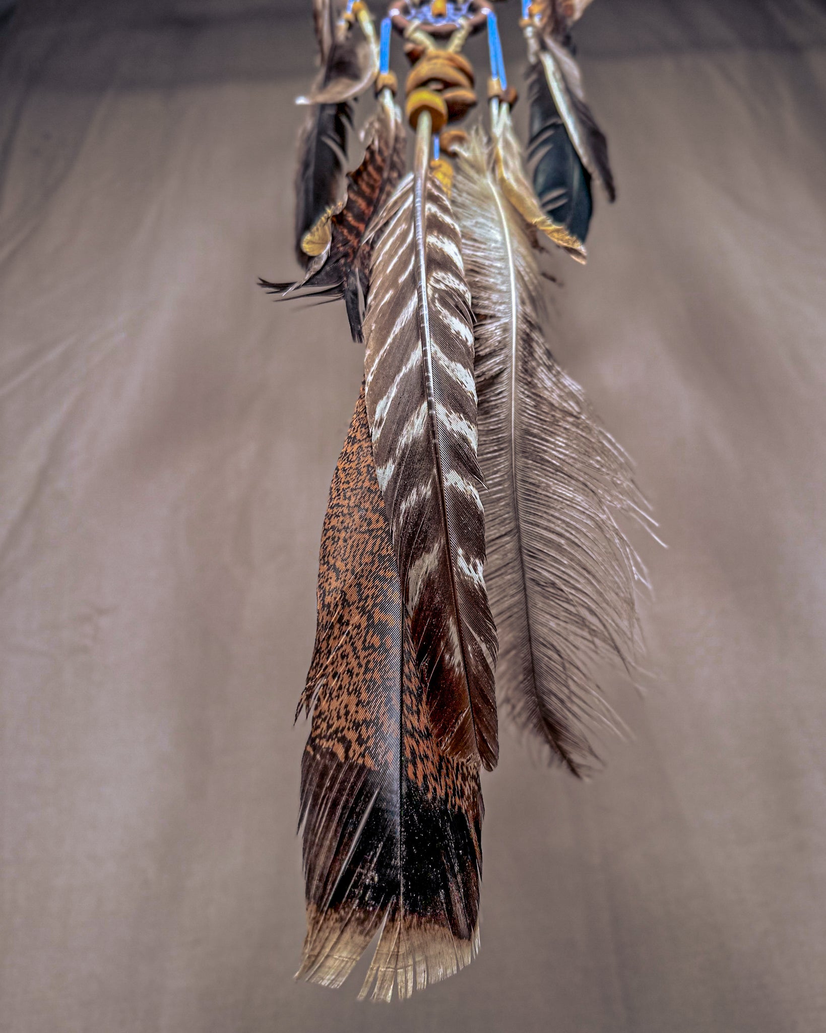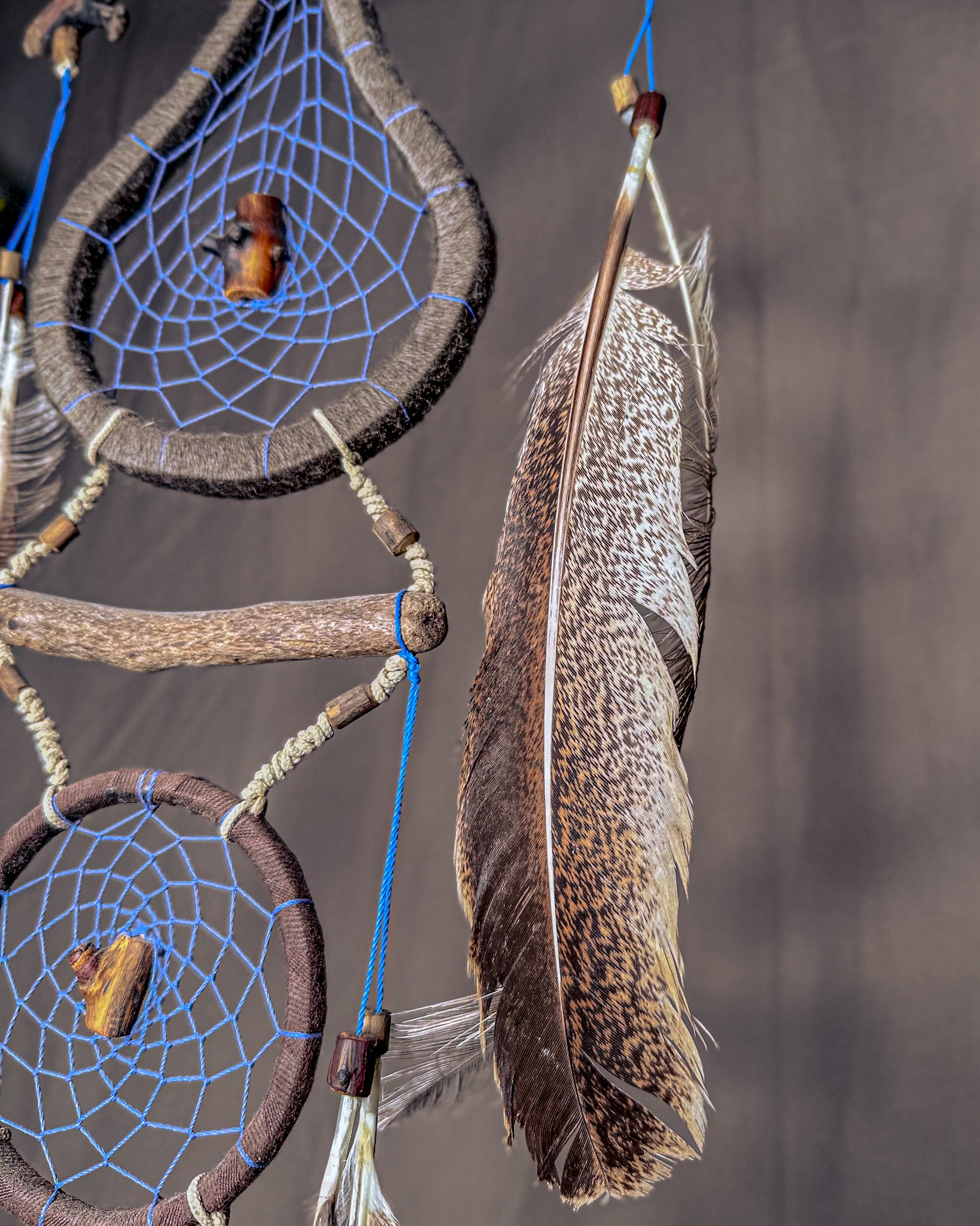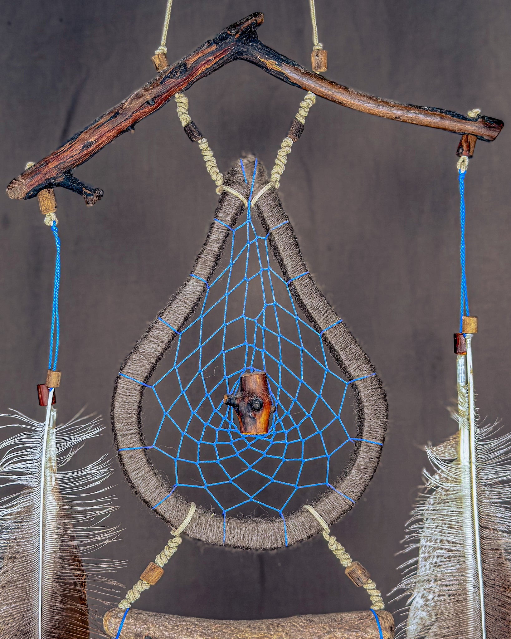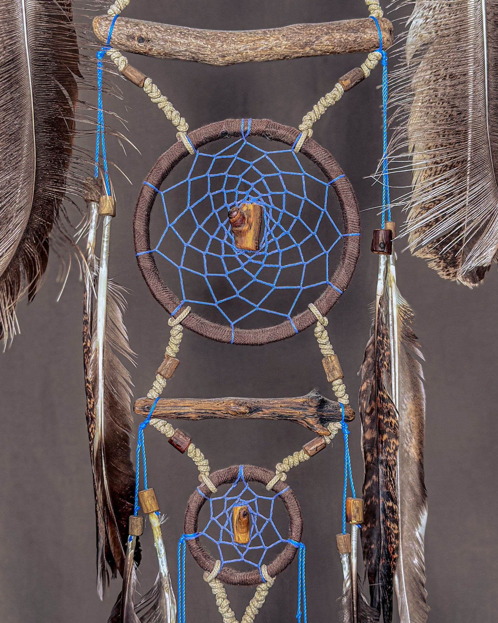 Keli lankai, daug medinių detalių, sluoksniuotas vaizdas ir gausybė smulkių akcentų sukuria gilią, gyvą kompoziciją. Tai vienas sudėtingiausių ir emociškai stipriausių mano darbų. Šioje gaudyklėje papildomos medinės detalės yra gręžiamos, formuojamos ir kruopščiai derinamos tarpusavyje. Kiekvienas elementas parenkamas ne atsitiktinai, o pagal formą, tekstūrą ir jausmą, kurį sukuria. Tinkle naudojamos papildomos detalės dar labiau įtraukia įsižiūrėti į gaminį. Tai gilesnis, detalesnis ir emociškai turtingesnis kūrinys. Jis turi daugiau medinių elementų ir raštų, kurie įkomponuojami taip, kad pasakotų istoriją ir kurtų stipresnį vizualinį bei emocinį ryšį.