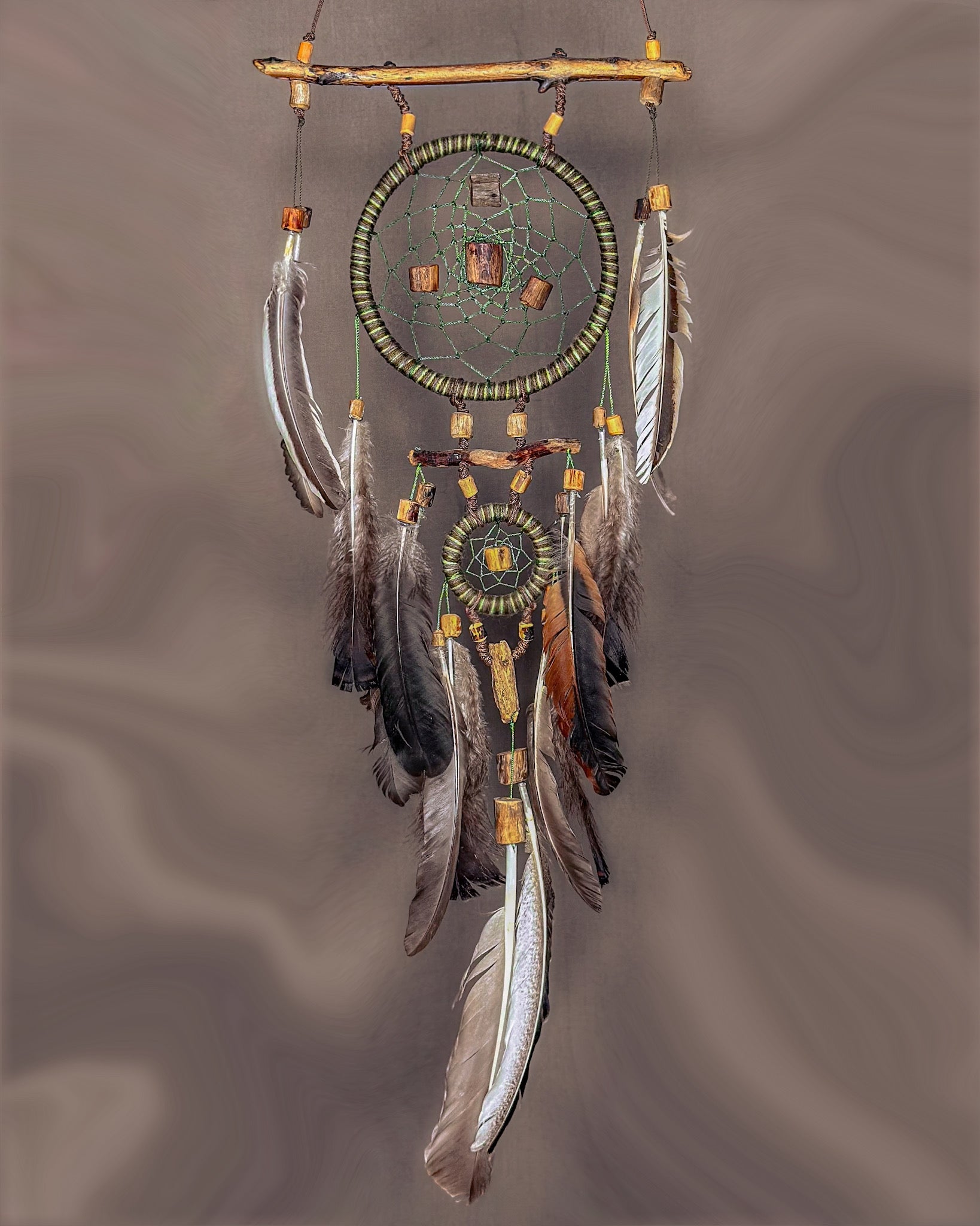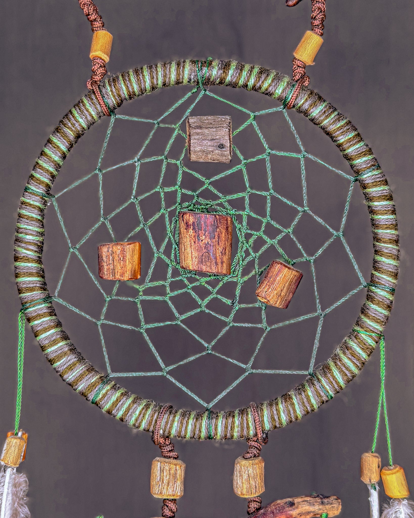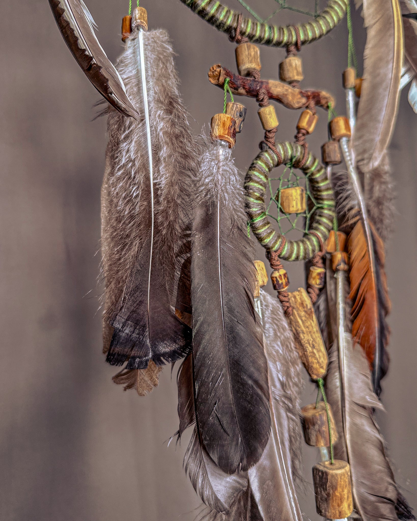 Rankų darbo, žemiškoji sapnų gaudyklė - „Miškas“. Medienos detalės ir karoliukai formuojami iš Baltijos jūros nuskalautų šakų. Savos gamybos mediniai lankai, kurių tinklai pinami intuityviai, leidžiant jiems „susidėlioti“ natūraliai. Plunksnas renku iš skirtingų Lietuvos kampų, šioje naudojau kalakutų, žąsų ir fazanų.