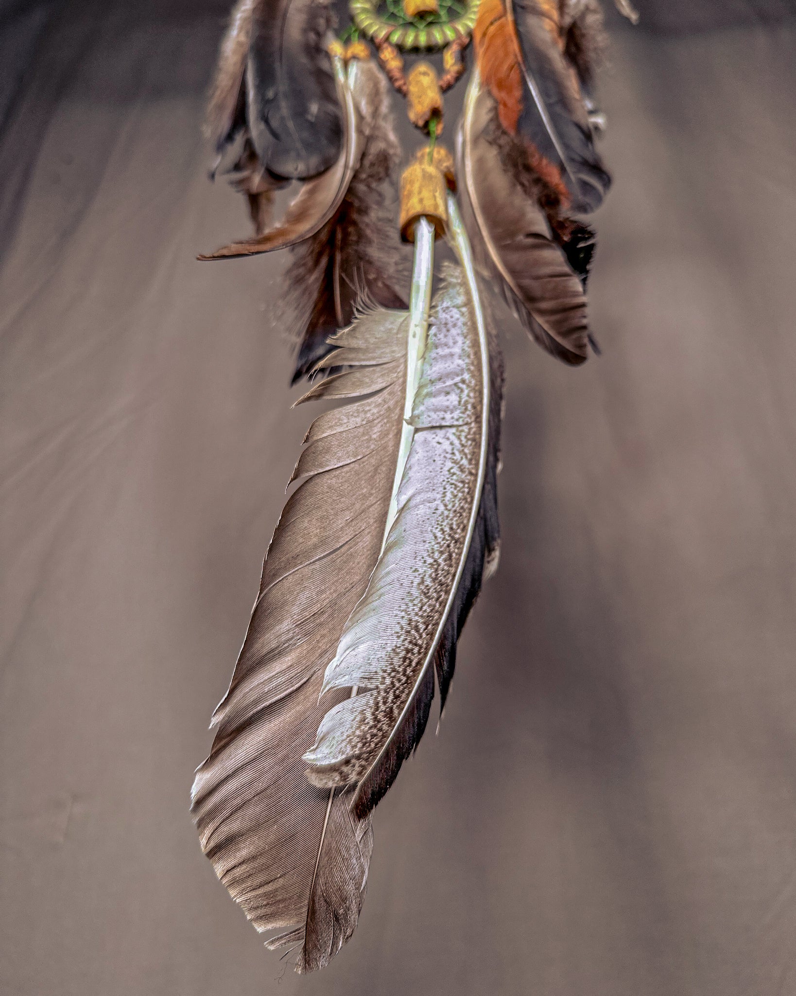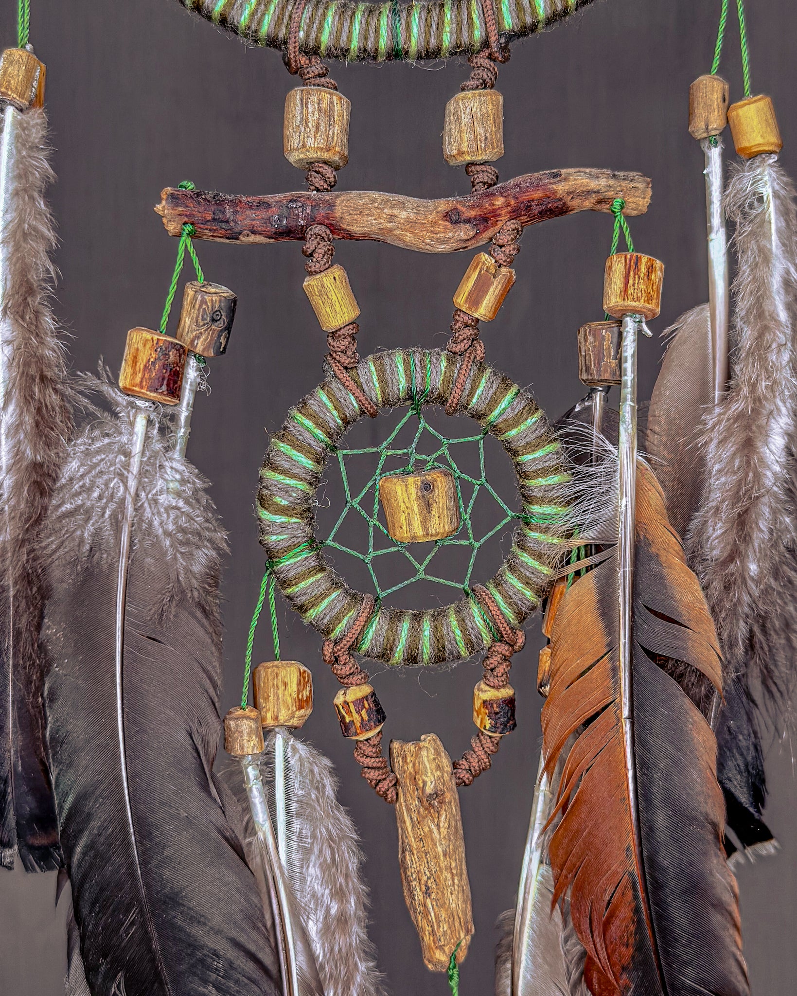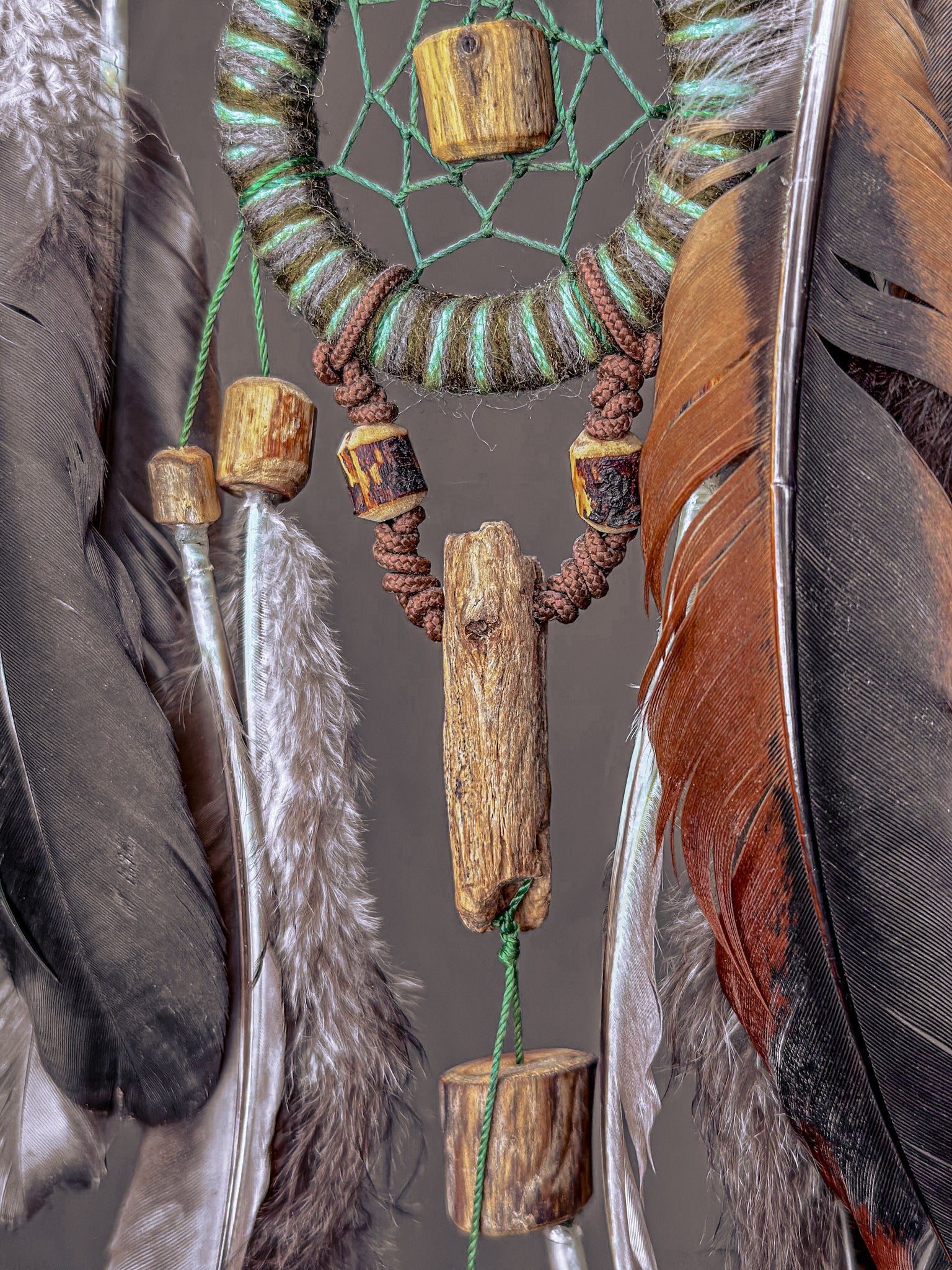 Rankų darbo, žemiškoji sapnų gaudyklė - „Miškas“. Medienos detalės ir karoliukai formuojami iš Baltijos jūros nuskalautų šakų. Savos gamybos mediniai lankai, kurių tinklai pinami intuityviai, leidžiant jiems „susidėlioti“ natūraliai. Plunksnas renku iš skirtingų Lietuvos kampų, šioje naudojau kalakutų, žąsų ir fazanų.