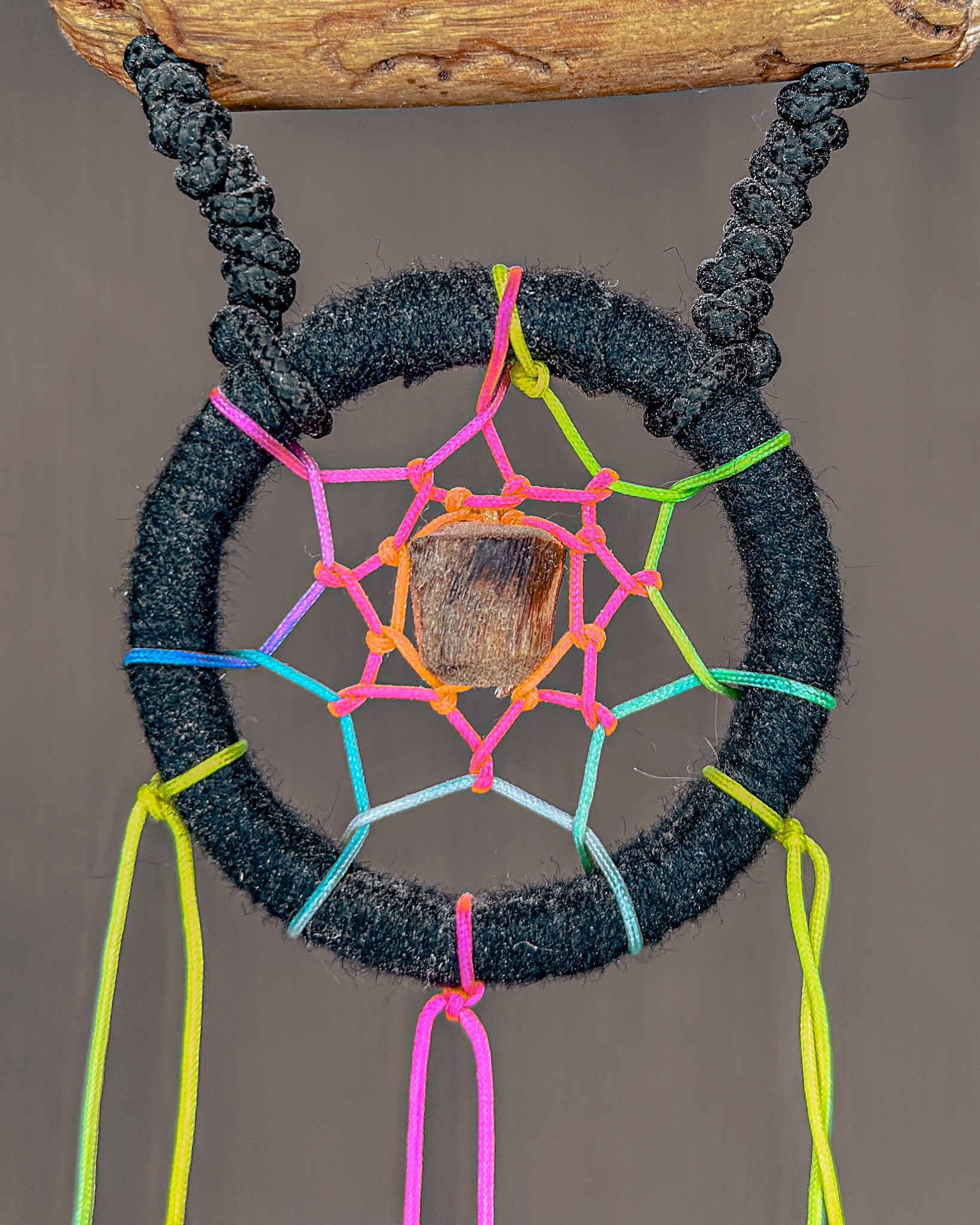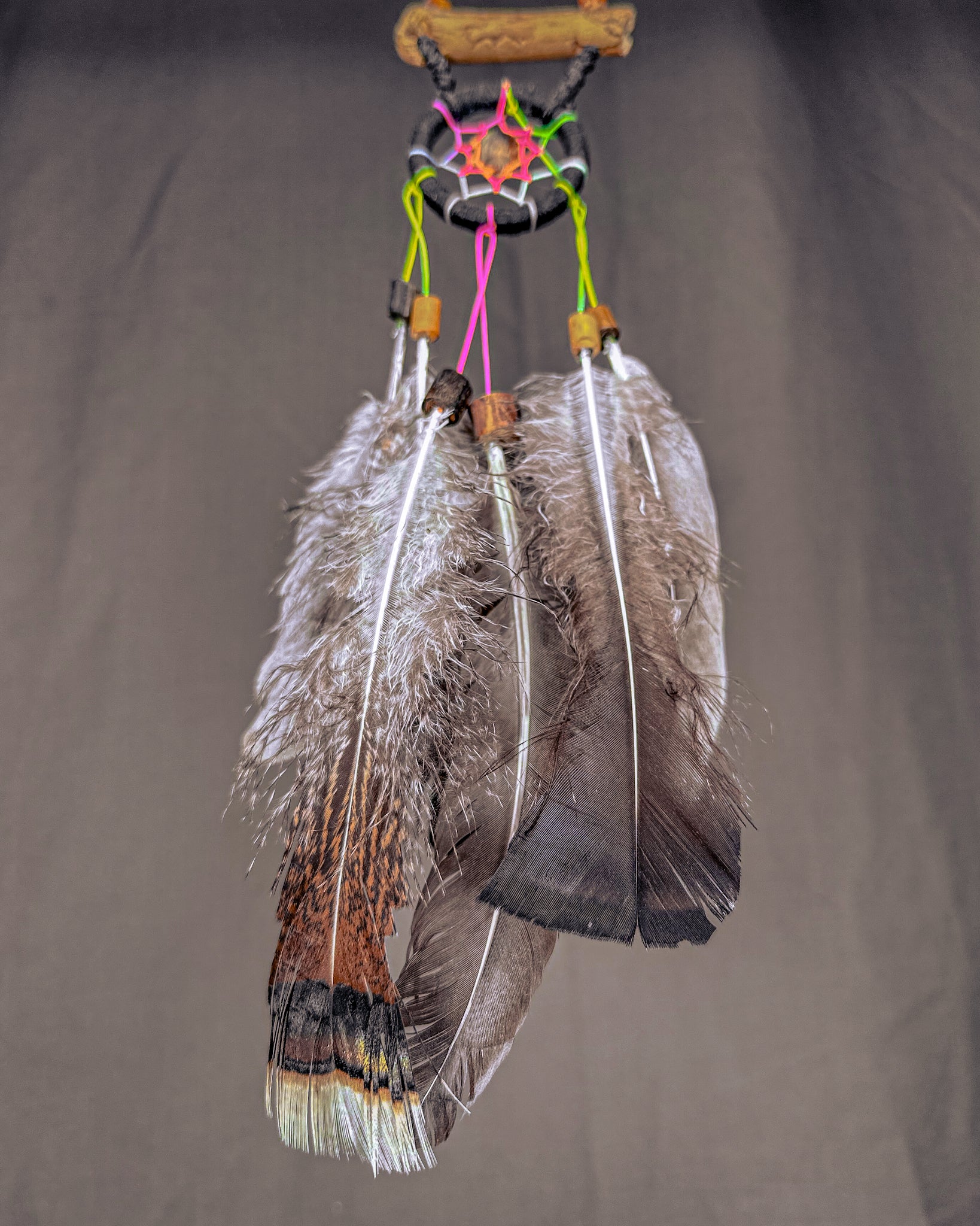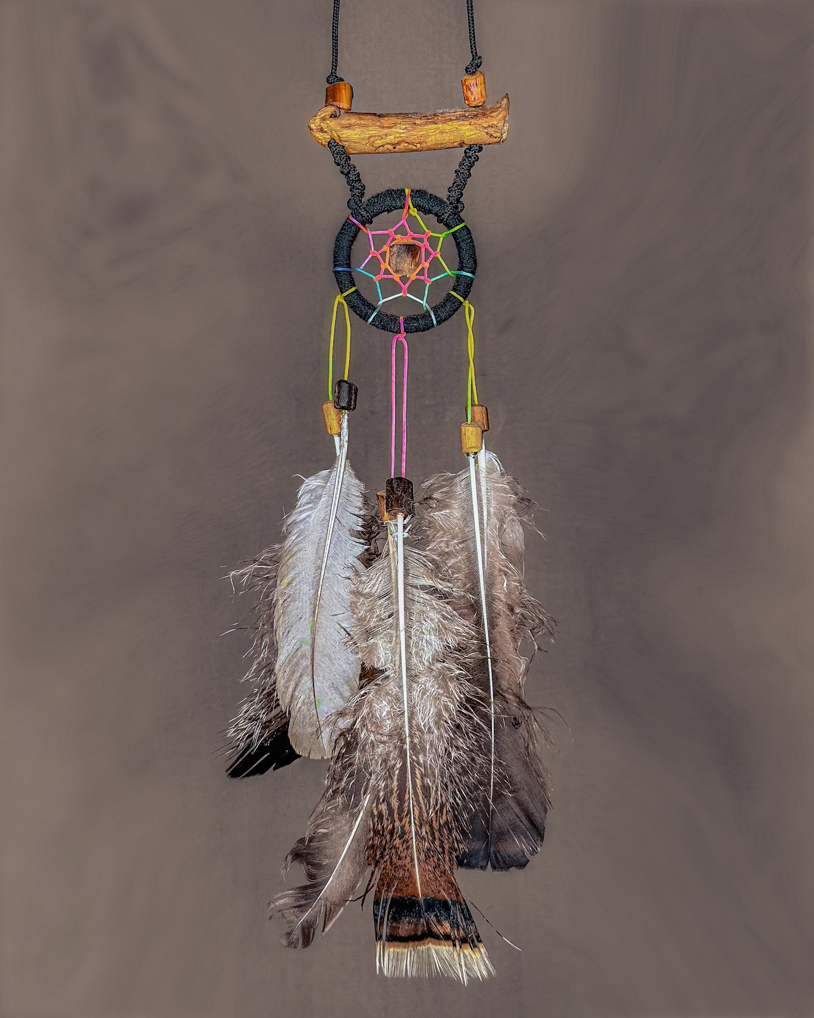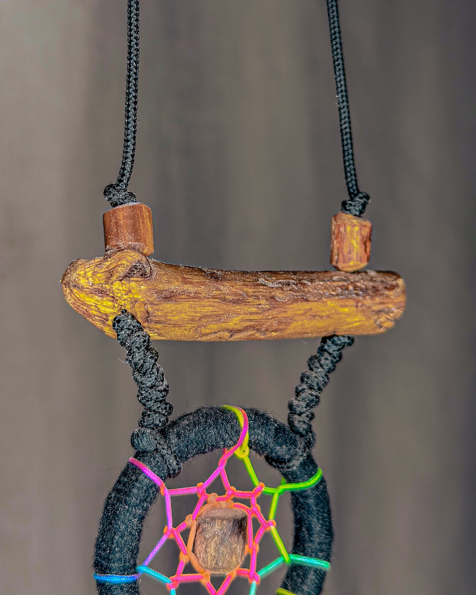 Rankų darbo, juodai spalvota sapnų gaudyklė - „Reivas“. Medienos detalės ir karoliukai formuojami iš Baltijos jūros nuskalautų šakų. Savos gamybos medinis lankas, kurio tinklas pinamas intuityviai, leidžiant jam „susidėlioti“ natūraliai. Plunksnas renku iš skirtingų Lietuvos kampų, šioje naudojau kalakutų.