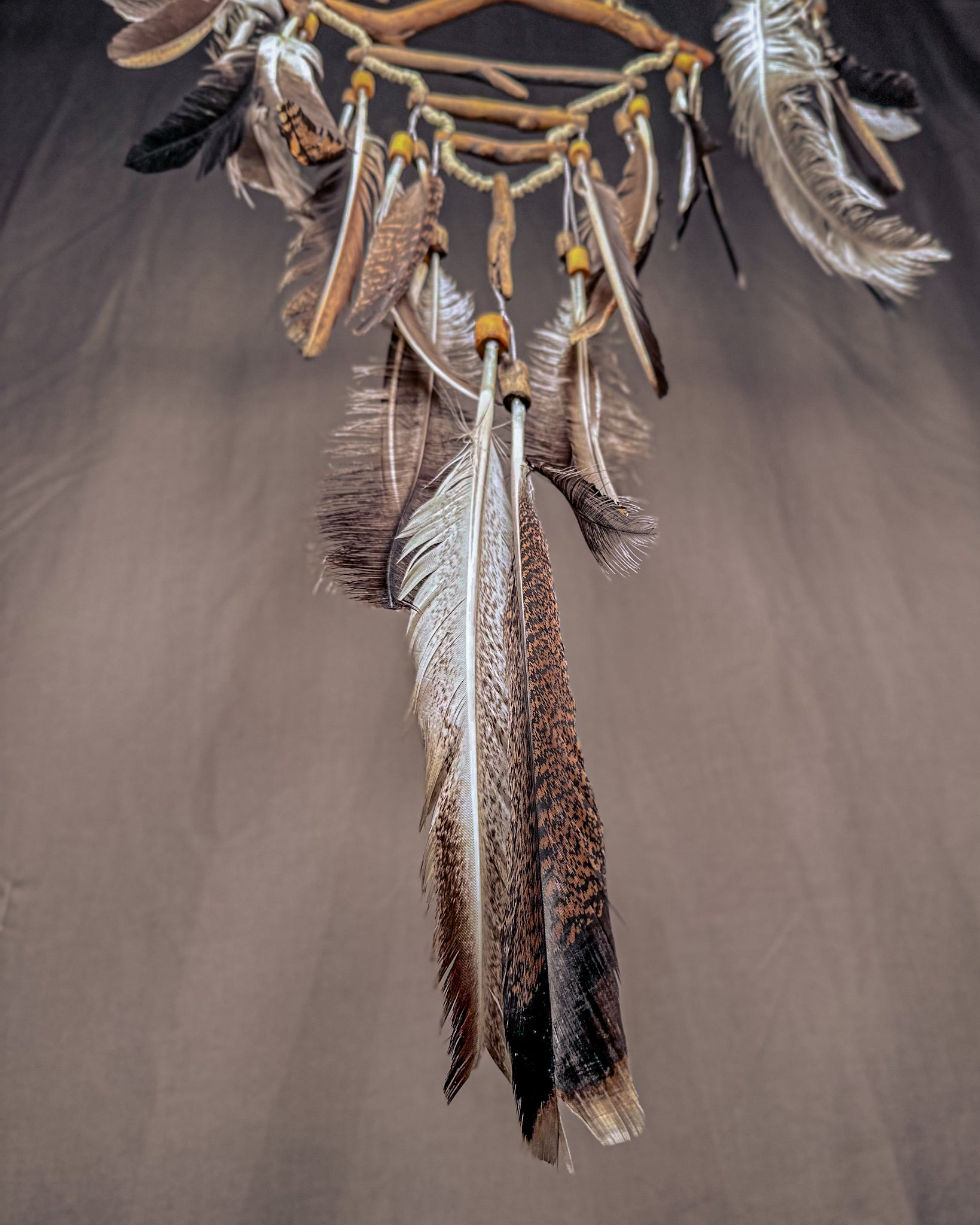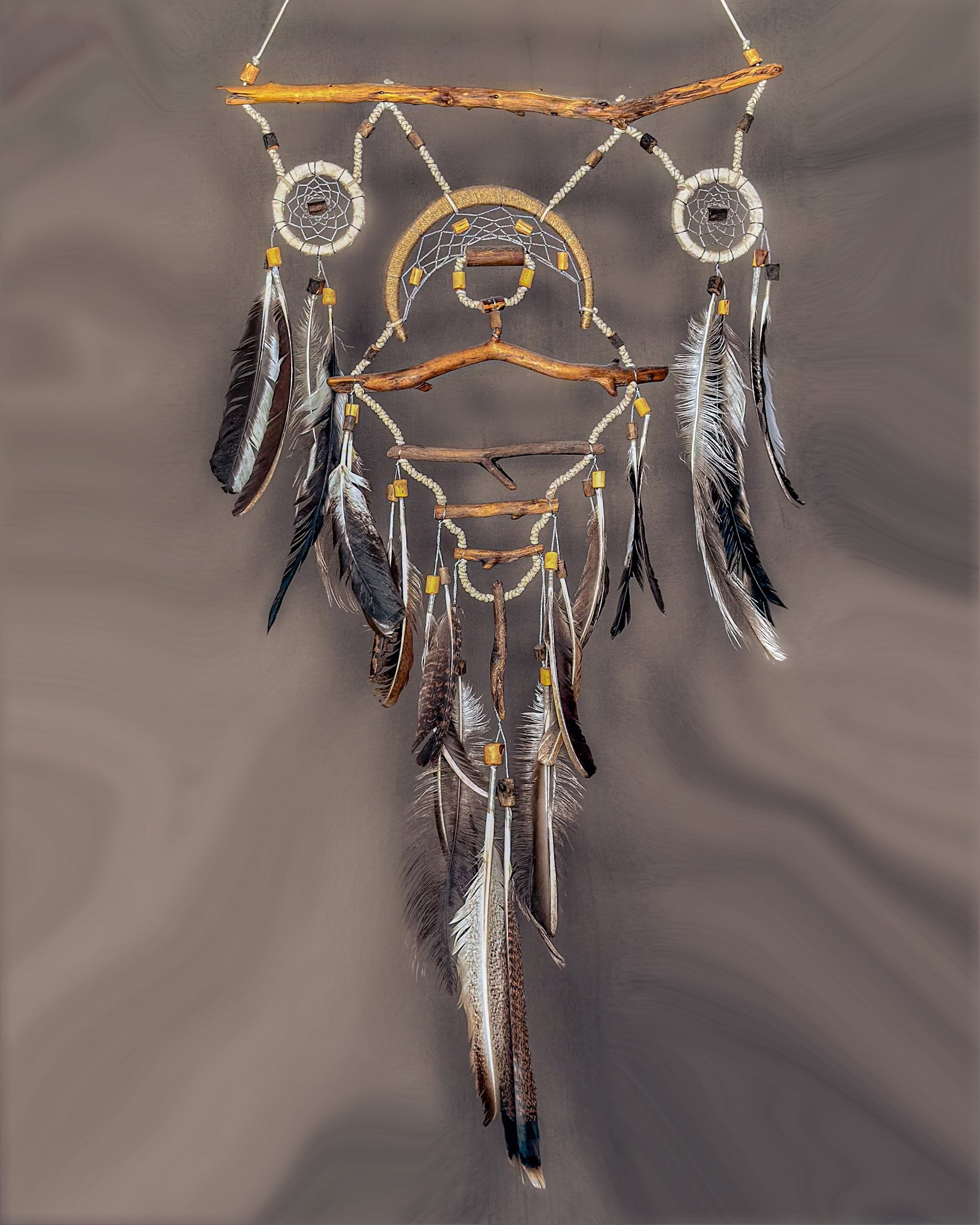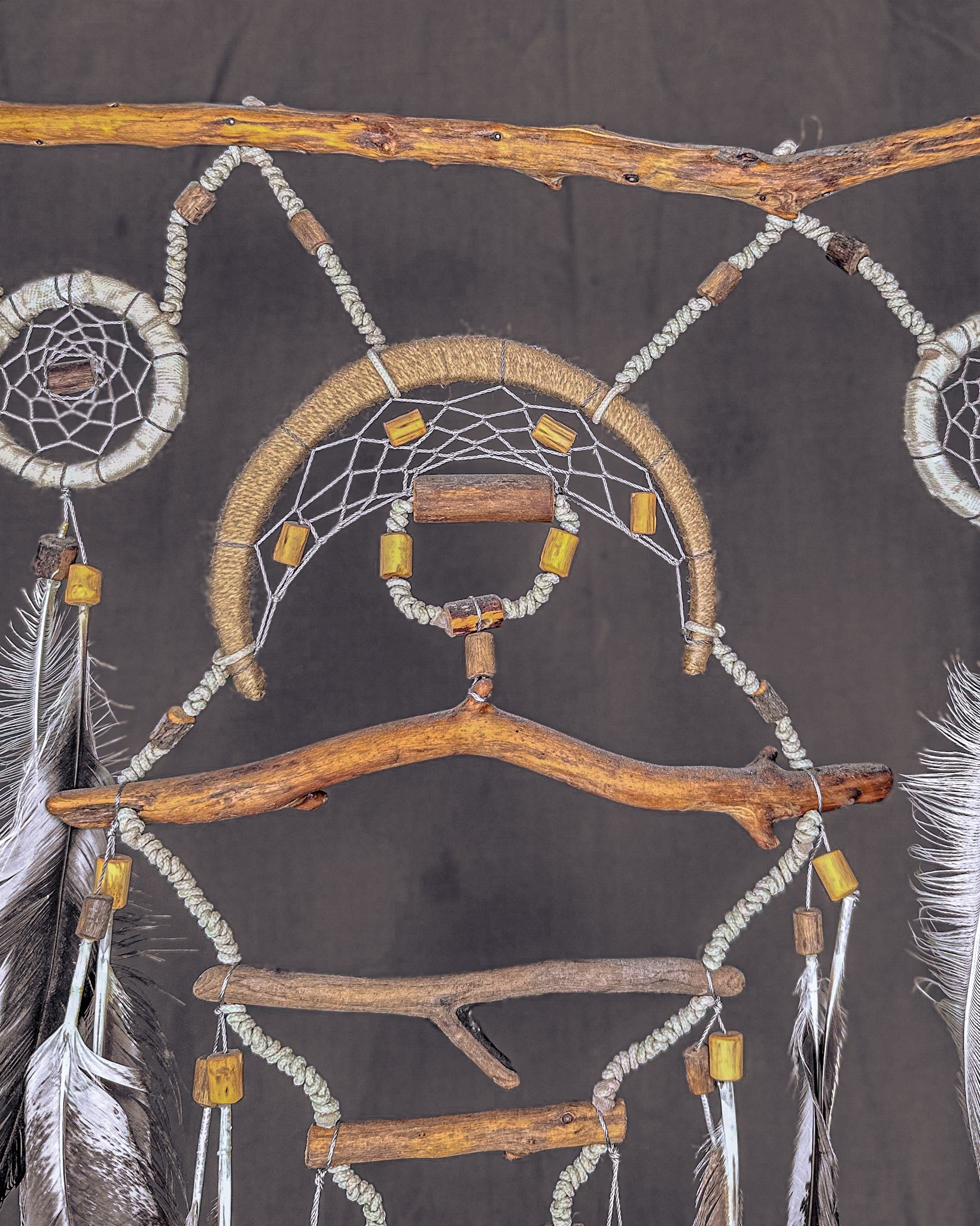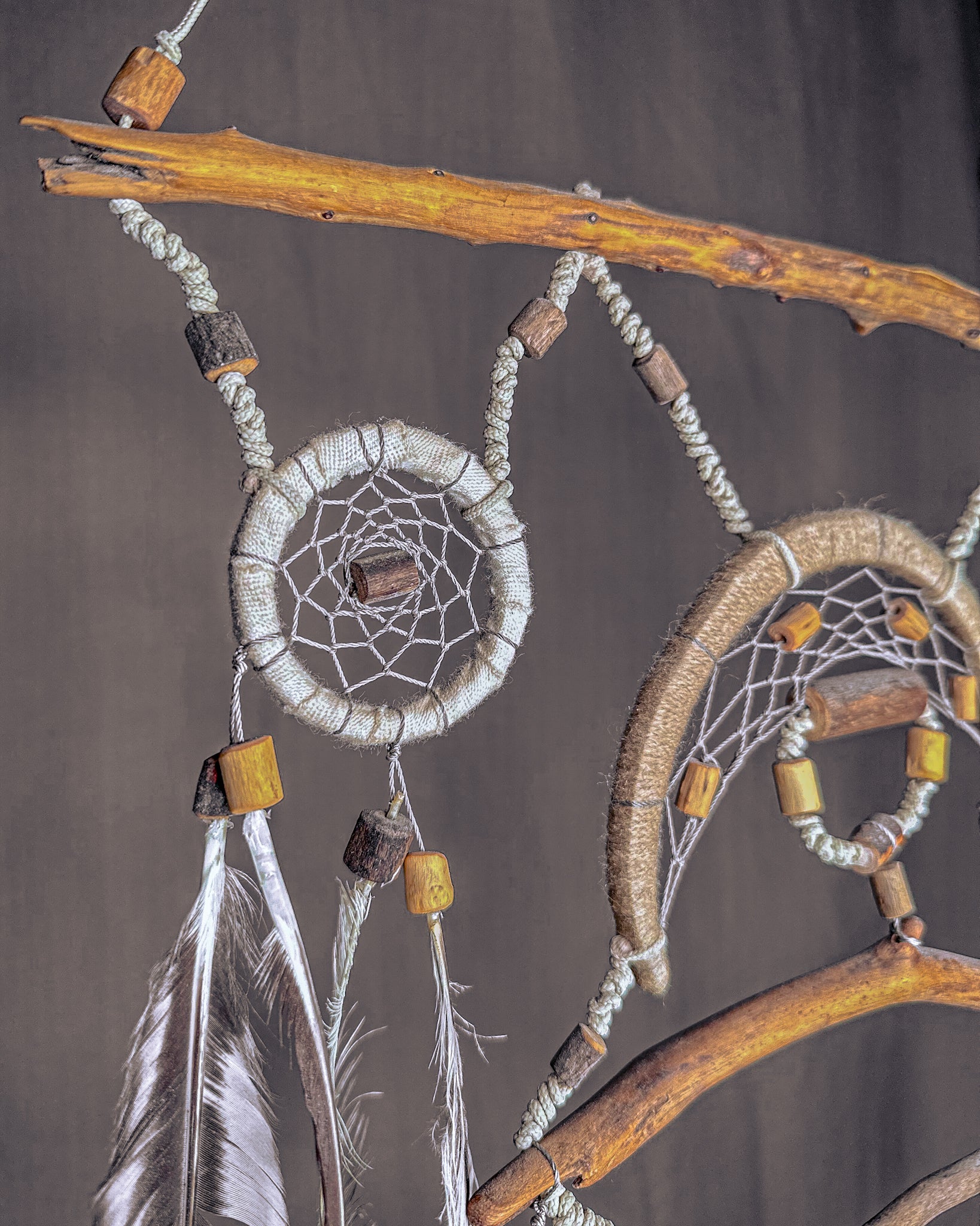 Keli lankai, daug medinių detalių, sluoksniuotas vaizdas ir gausybė smulkių akcentų sukuria gilią, gyvą kompoziciją. Tai vienas sudėtingiausių ir emociškai stipriausių mano darbų. Šioje gaudyklėje papildomos medinės detalės yra gręžiamos, formuojamos ir kruopščiai derinamos tarpusavyje. Kiekvienas elementas parenkamas ne atsitiktinai, o pagal formą, tekstūrą ir jausmą, kurį sukuria. Tinkle naudojamos papildomos detalės dar labiau įtraukia įsižiūrėti į gaminį. Tai gilesnis, detalesnis ir emociškai turtingesnis kūrinys. Jis turi daugiau medinių elementų ir raštų, kurie įkomponuojami taip, kad pasakotų istoriją ir kurtų stipresnį vizualinį bei emocinį ryšį.