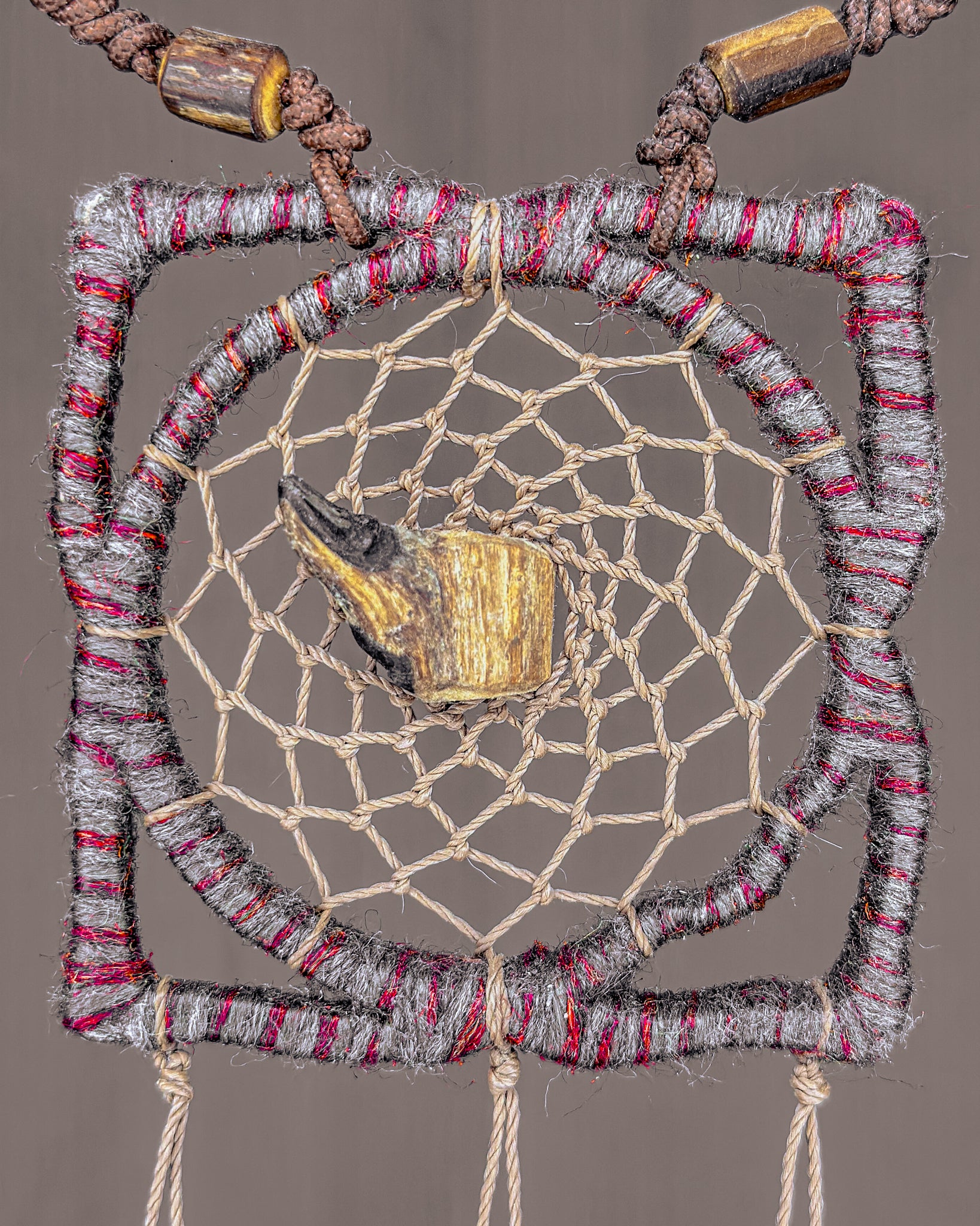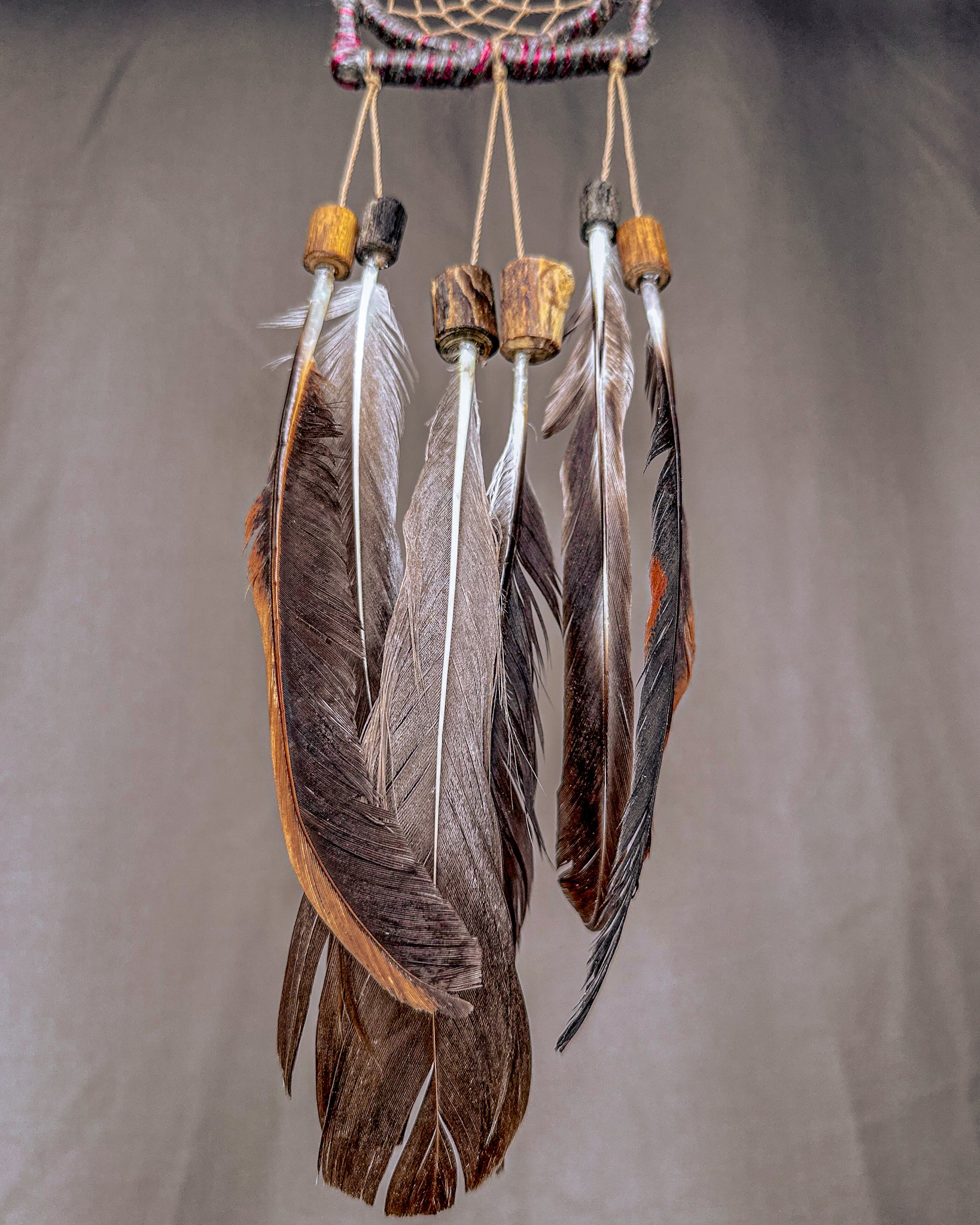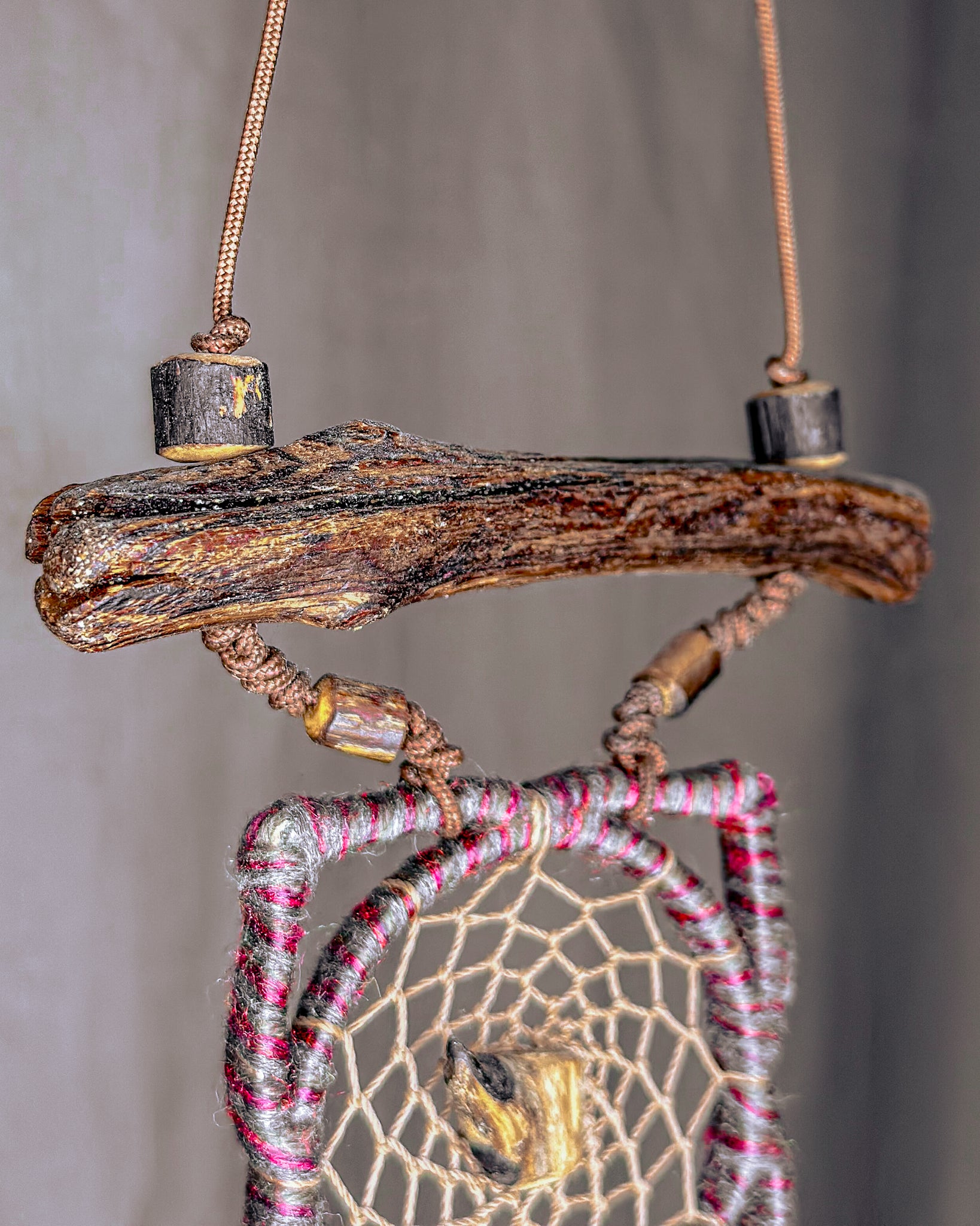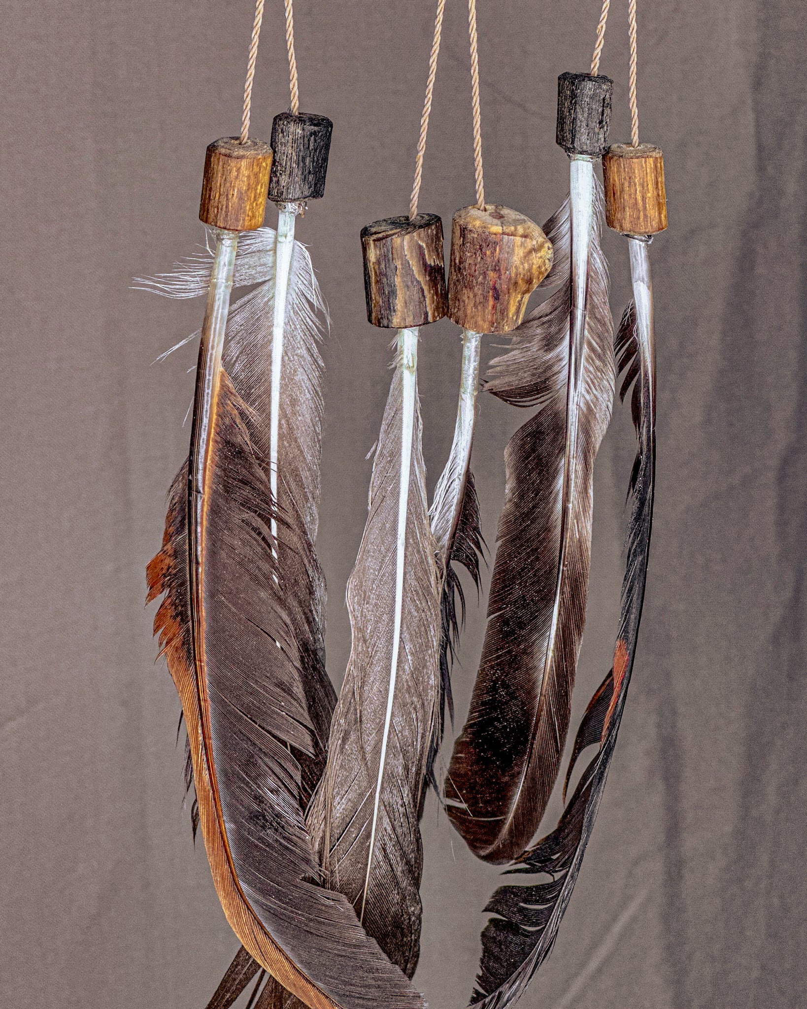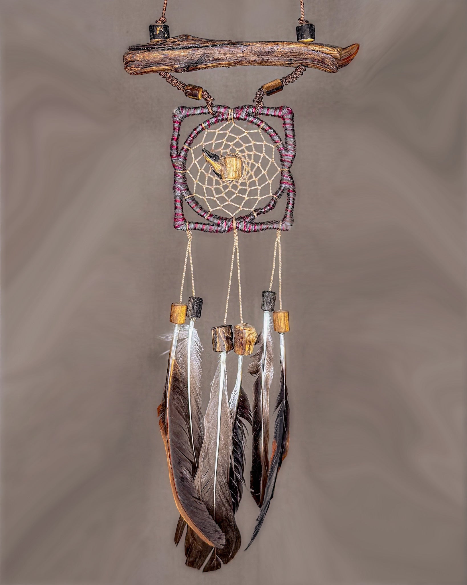 Rankų darbo, harmonizuojanti sapnų gaudyklė - „Šaknies chakra". Lanko forma, viena iš septynių chakrų, reprezentuoja stabilumą, apsaugą, įsižeminimą ir pasitikėjimą. Medienos detalės ir karoliukai formuojami iš Baltijos jūros nuskalautų šakų. Savos gamybos medinis lankas, kurio tinklas pinamas intuityviai, leidžiant jam „susidėlioti“ natūraliai. Plunksnas renku iš skirtingų Lietuvos kampų, šioje naudojau fazanų ir žąsų.