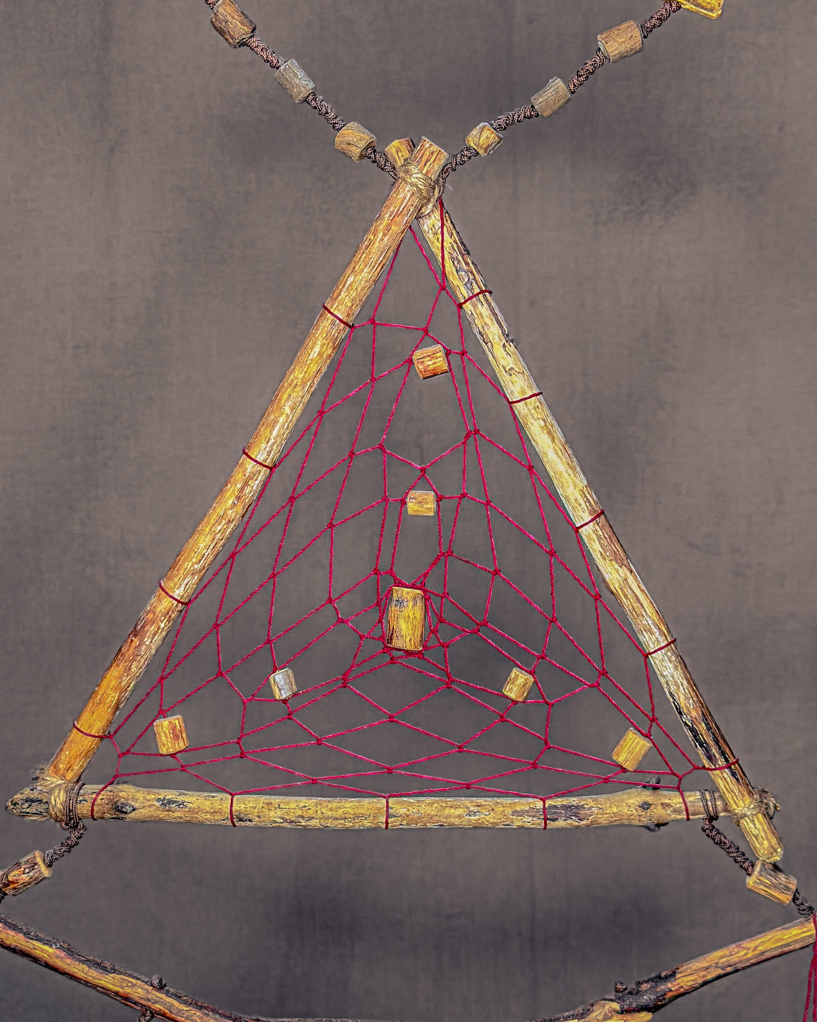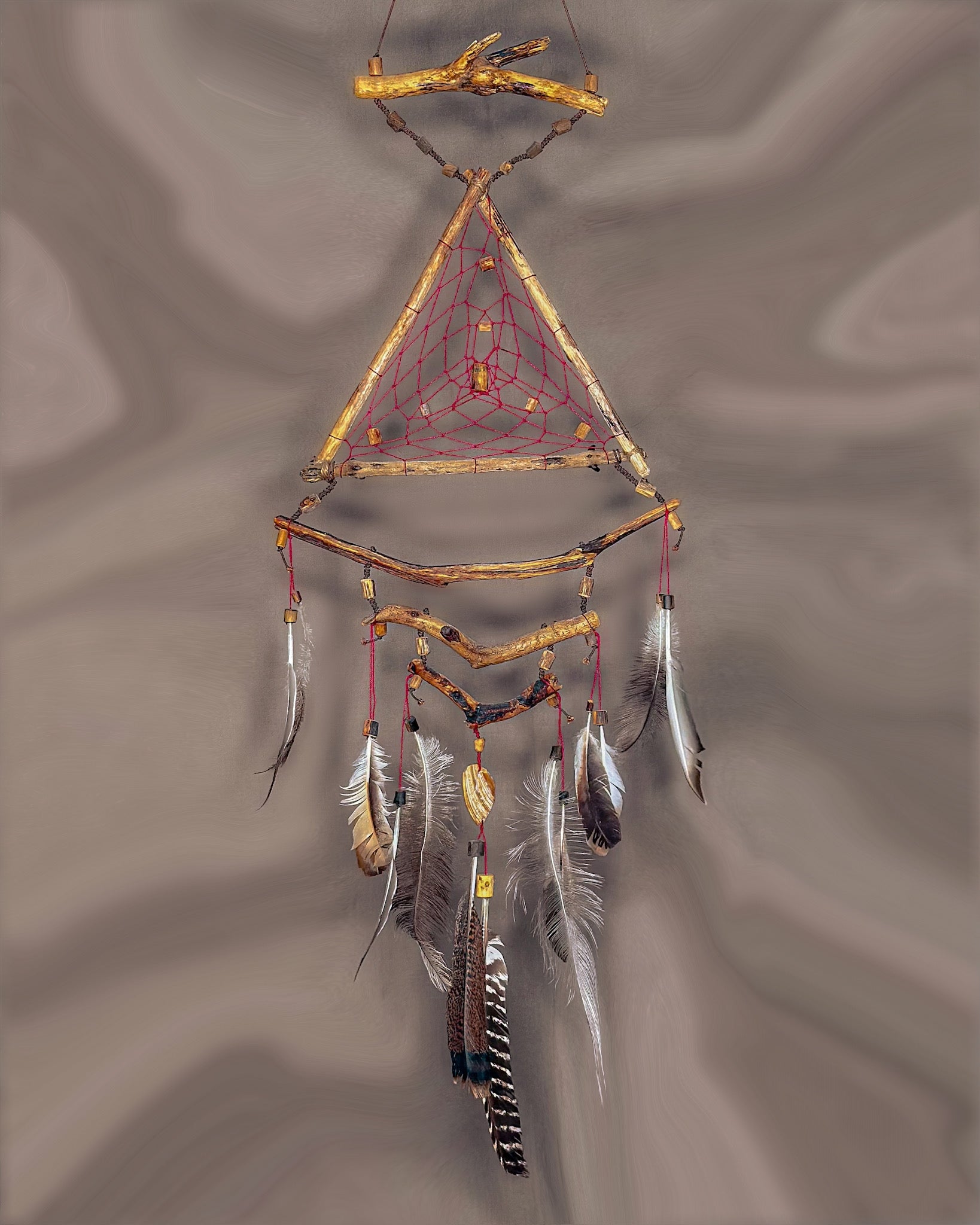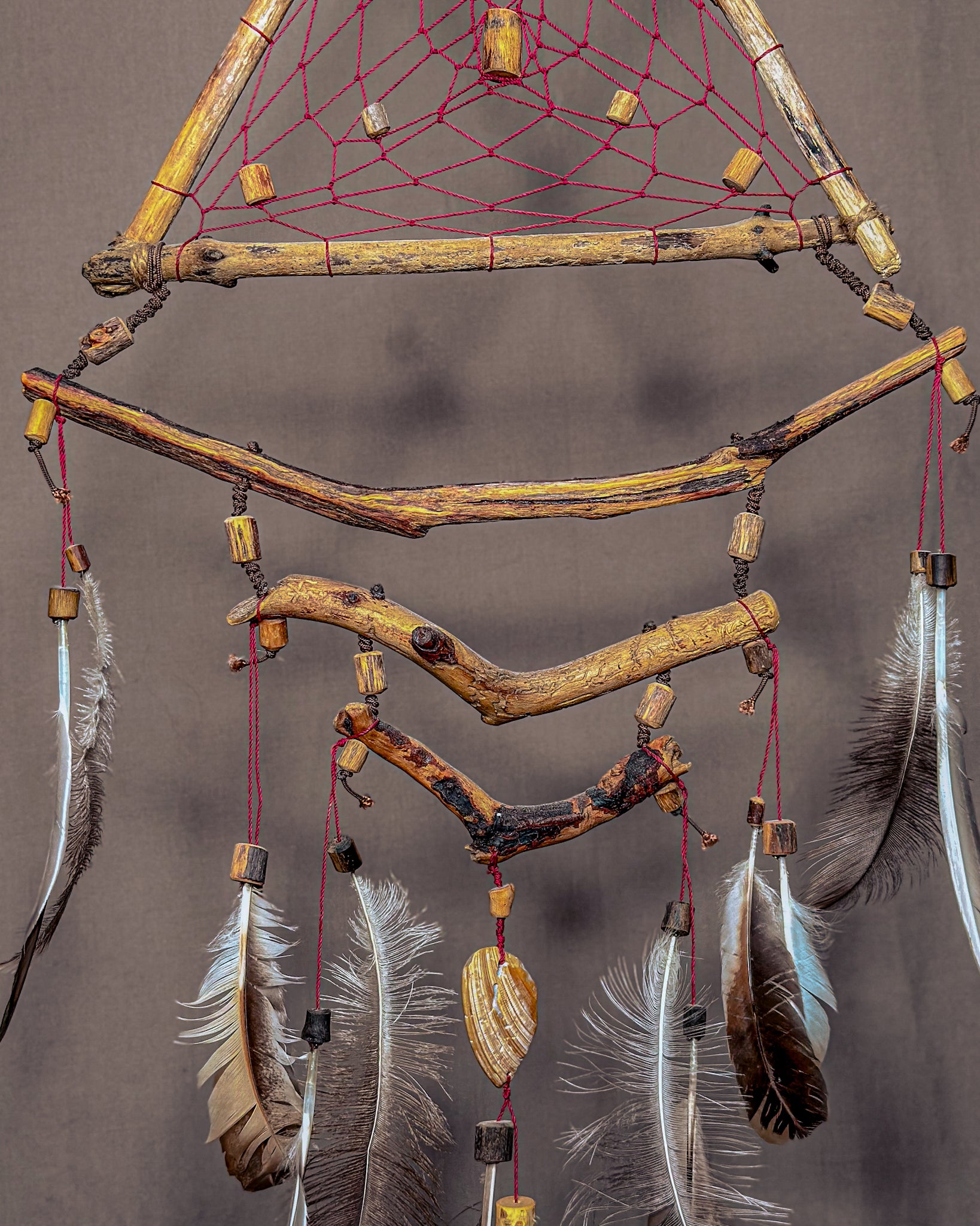 Rankų darbo, išskirtinė sapnų gaudyklė - „Ugnis“. Trikampiu alchemijoje simbolizuojama ugnies ženklas. Medienos detalės ir karoliukai formuojami iš Baltijos jūros nuskalautų šakų. Trikampis gamintas iš tos pačios medienos, o jo tinklas pinams intuityviai, leidžiant jam „susidėlioti“ natūraliai. Kūrinyje interpretuota kriauklė, kurią ištraukiau iš rytinės Amerikos pakrantės, Atlanto vandenyno. Plunksnas renku iš skirtingų Lietuvos kampų, šioje naudojau stručių, kalakutų, pelėdos/apuoko ir žąsų.