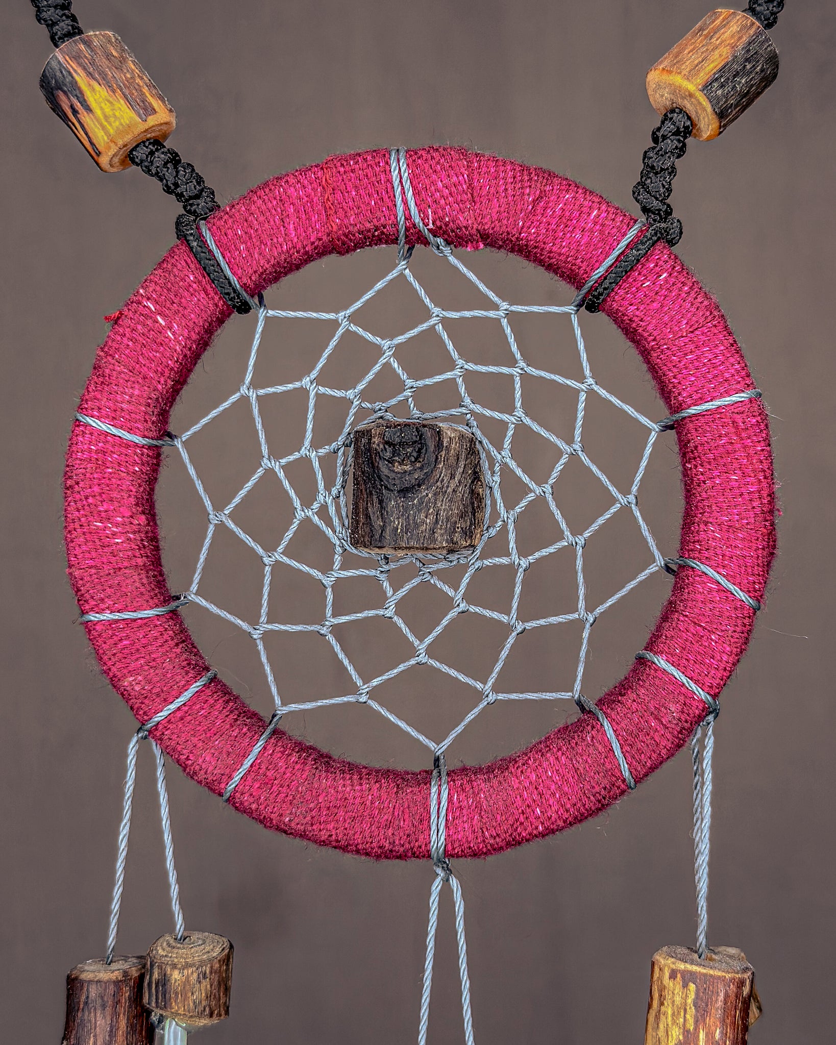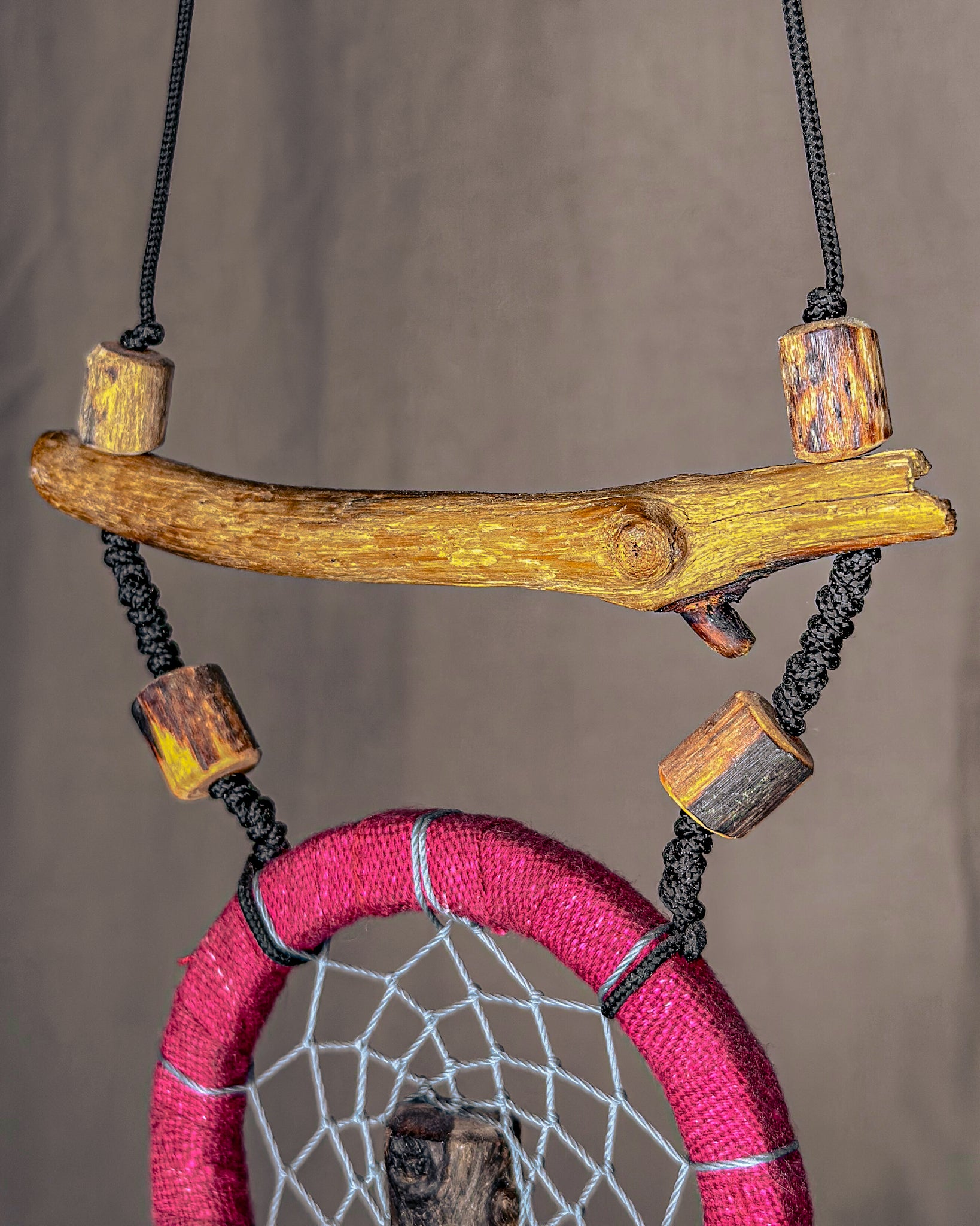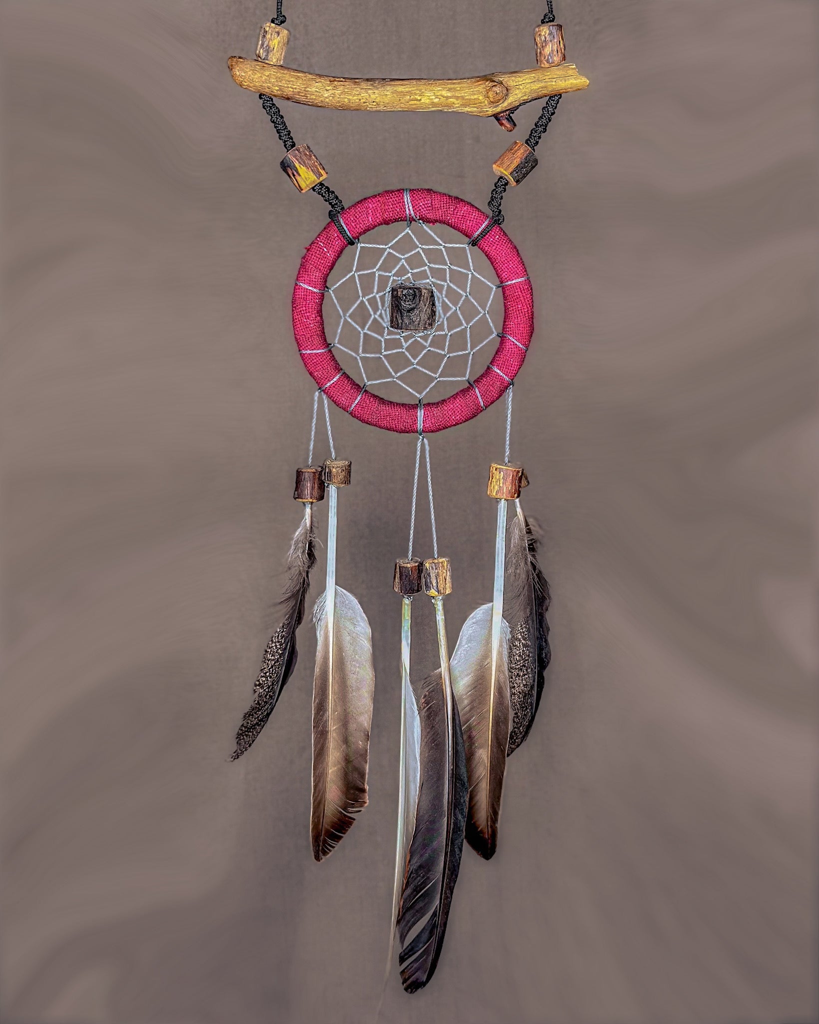 Rankų darbo, spinduliuojanti sapnų gaudyklė - „Žiedas“. Medienos detalės ir karoliukai formuojami iš Baltijos jūros nuskalautų šakų. Savos gamybos medinis lankas, kurio tinklas pinamas intuityviai, leidžiant jam „susidėlioti“ natūraliai. Plunksnas renku iš skirtingų Lietuvos kampų, šioje naudojau žąsų ir fazanų.