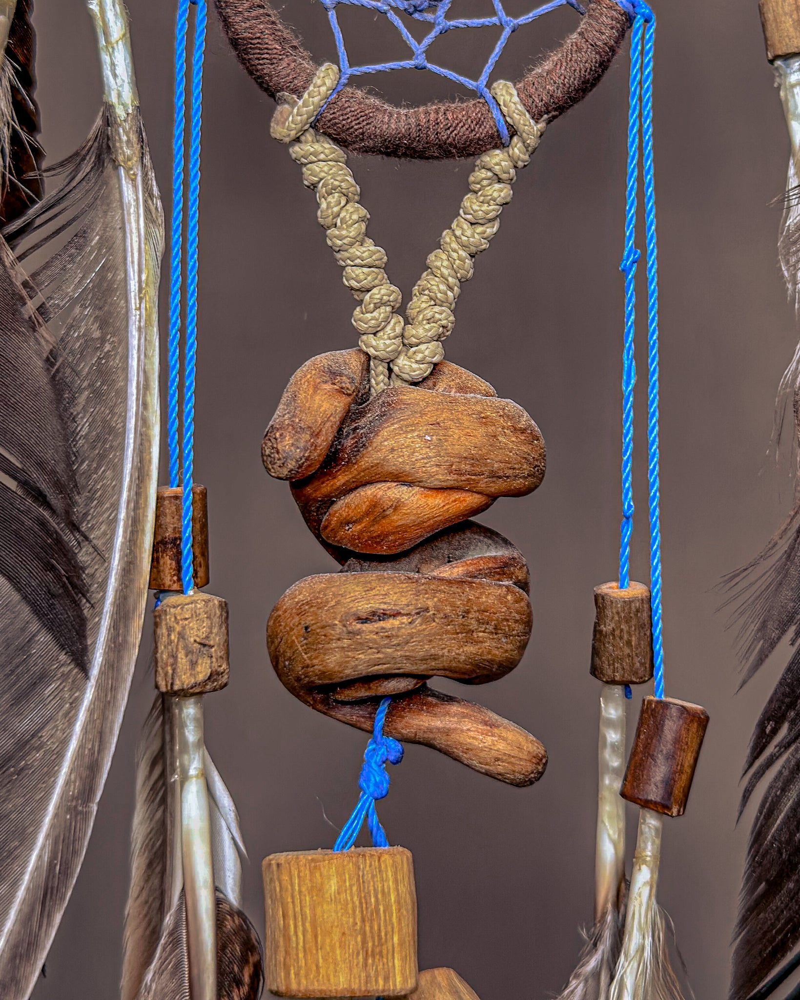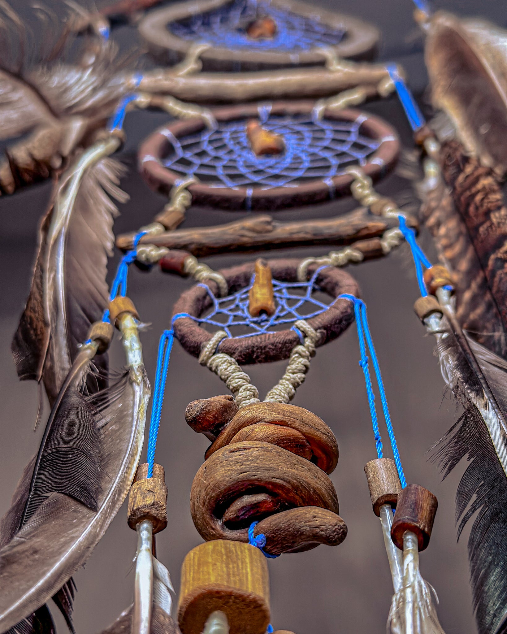 Keli lankai, daug medinių detalių, sluoksniuotas vaizdas ir gausybė smulkių akcentų sukuria gilią, gyvą kompoziciją. Tai vienas sudėtingiausių ir emociškai stipriausių mano darbų. Šioje gaudyklėje papildomos medinės detalės yra gręžiamos, formuojamos ir kruopščiai derinamos tarpusavyje. Kiekvienas elementas parenkamas ne atsitiktinai, o pagal formą, tekstūrą ir jausmą, kurį sukuria. Tinkle naudojamos papildomos detalės dar labiau įtraukia įsižiūrėti į gaminį. Tai gilesnis, detalesnis ir emociškai turtingesnis kūrinys. Jis turi daugiau medinių elementų ir raštų, kurie įkomponuojami taip, kad pasakotų istoriją ir kurtų stipresnį vizualinį bei emocinį ryšį.