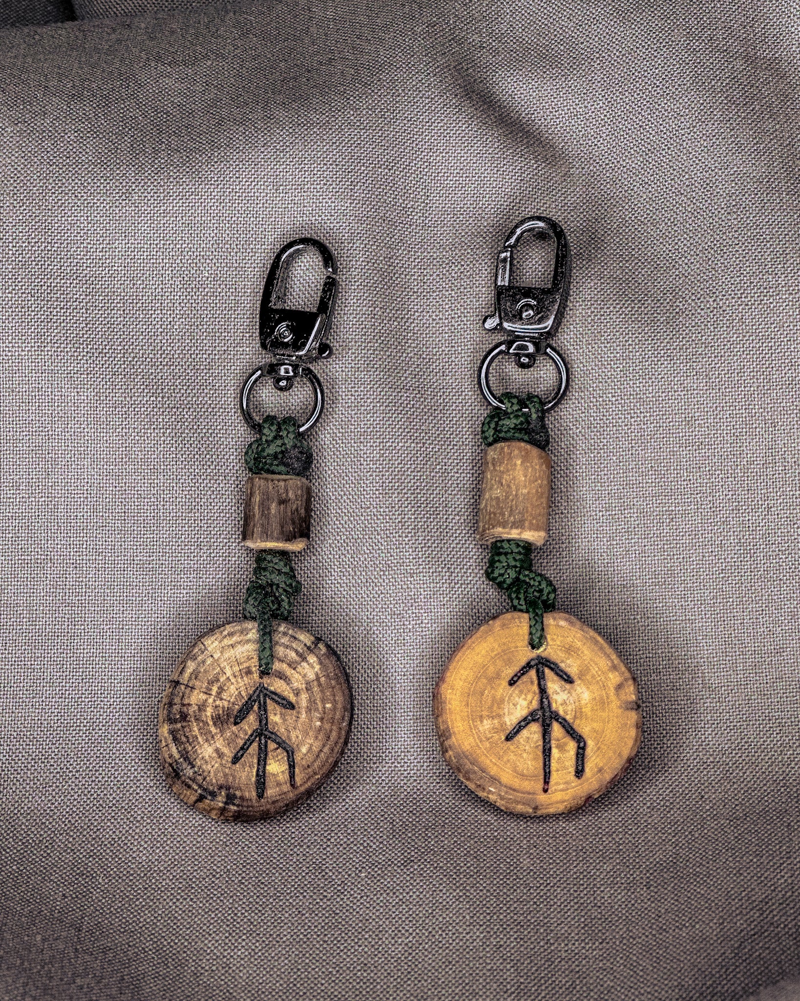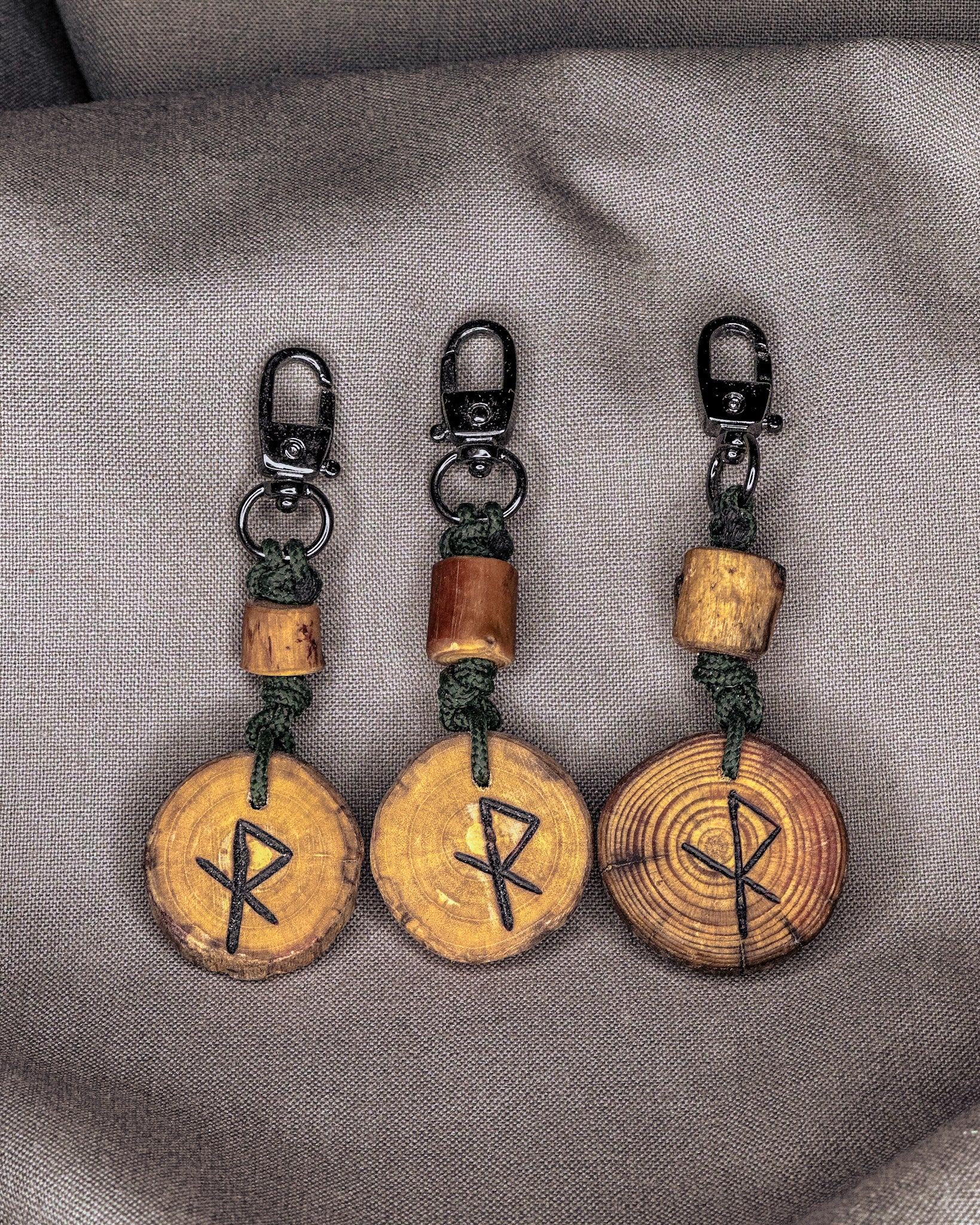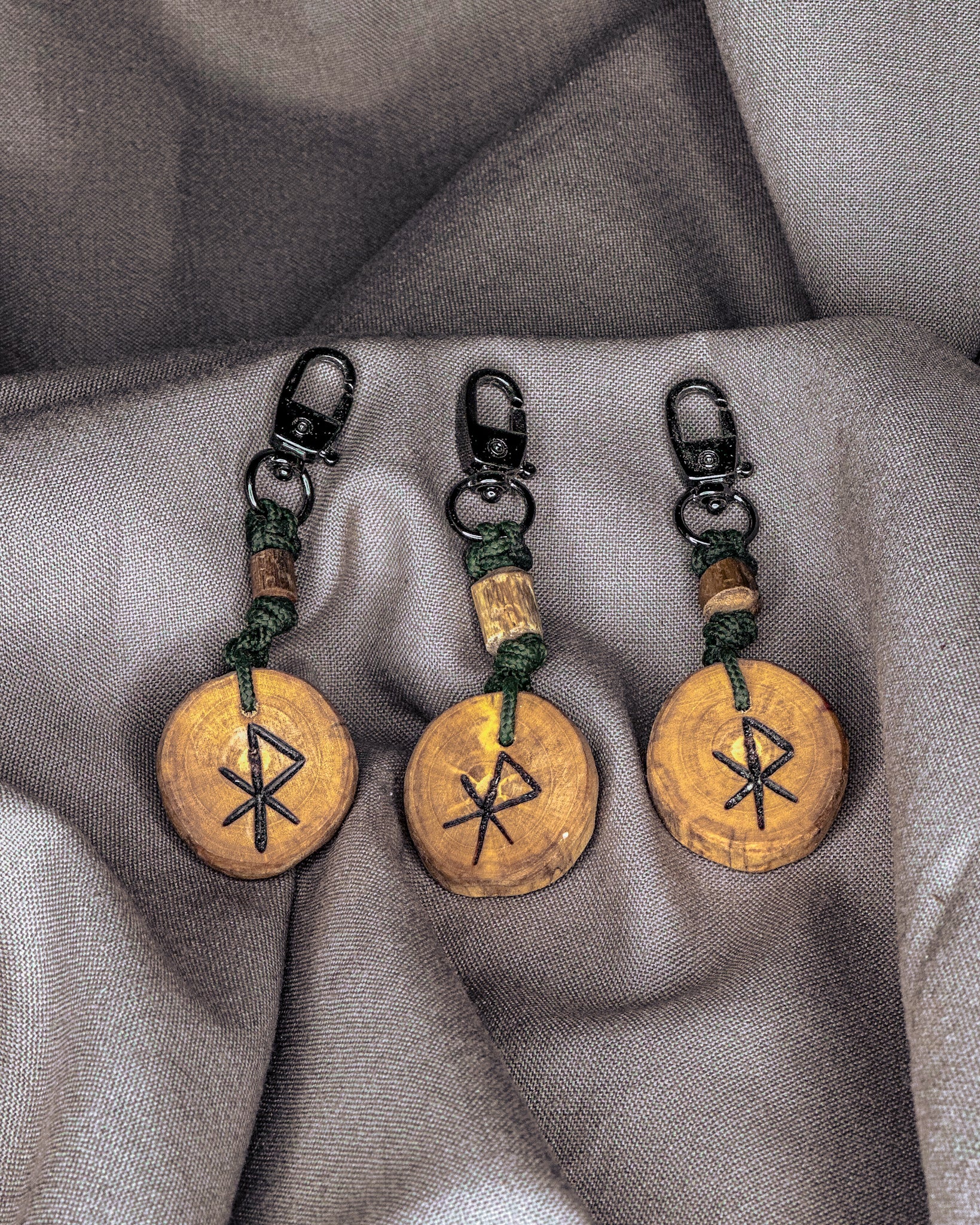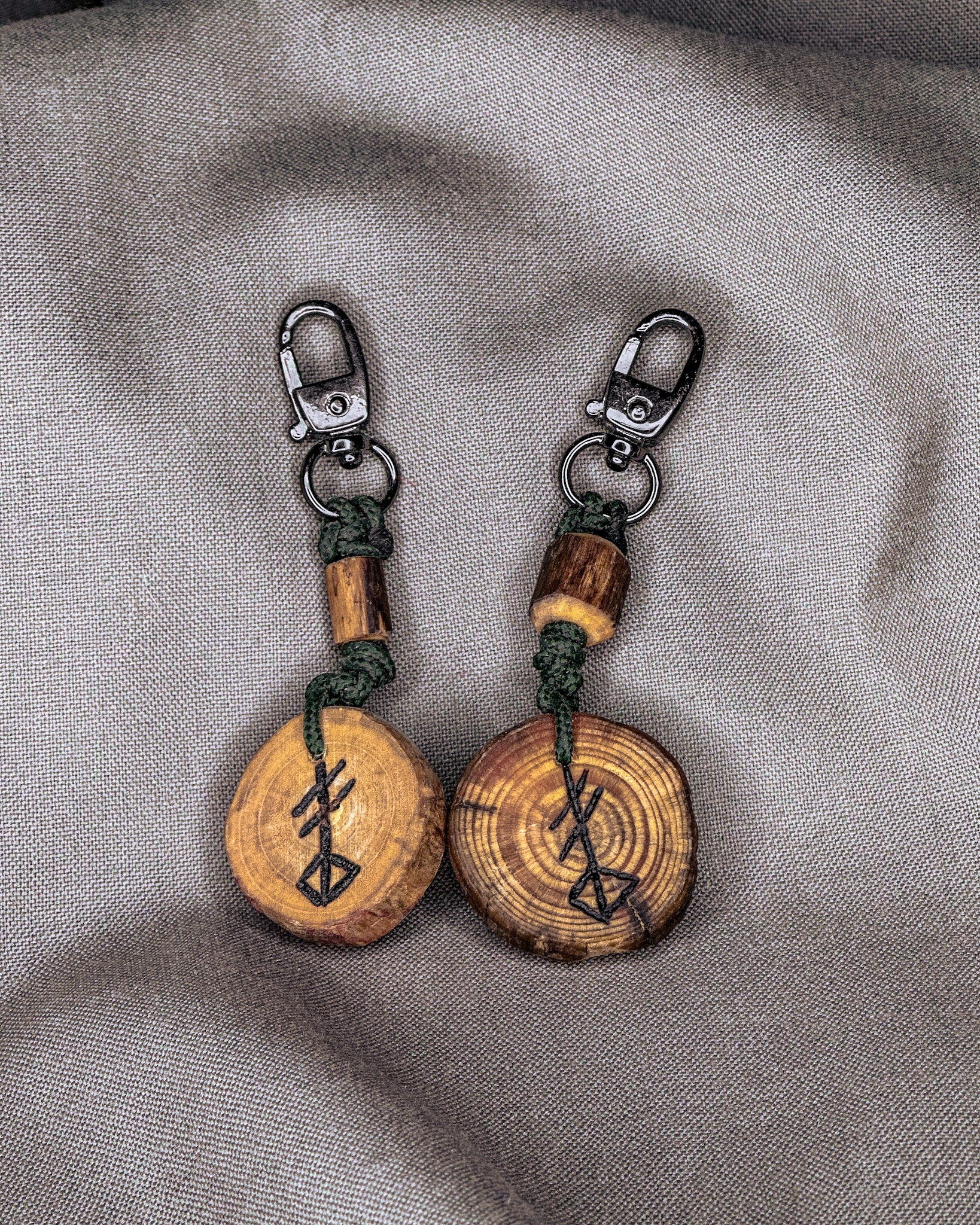 Šie raktų pakabukai gaminami iš Baltijos jūros nuskalautos medienos – šakų, kurias vanduo, druska ir smėlis nugludino taip, kaip tai geba tik gamta. Atrinktą medieną pjaustau rankomis, į kiekvieną amuletą įdeginu simbolį, o paviršių įtrinu linų sėmenų aliejumi, kad išryškėtų natūralios medžio tekstūros. Kiekvieno pakabuko pabaigoje įpinama tvirta virvė ir montuojamos kokybiškos metalinės detalės, užtikrinančios ilgaamžiškumą ir patogų naudojimą kasdien.