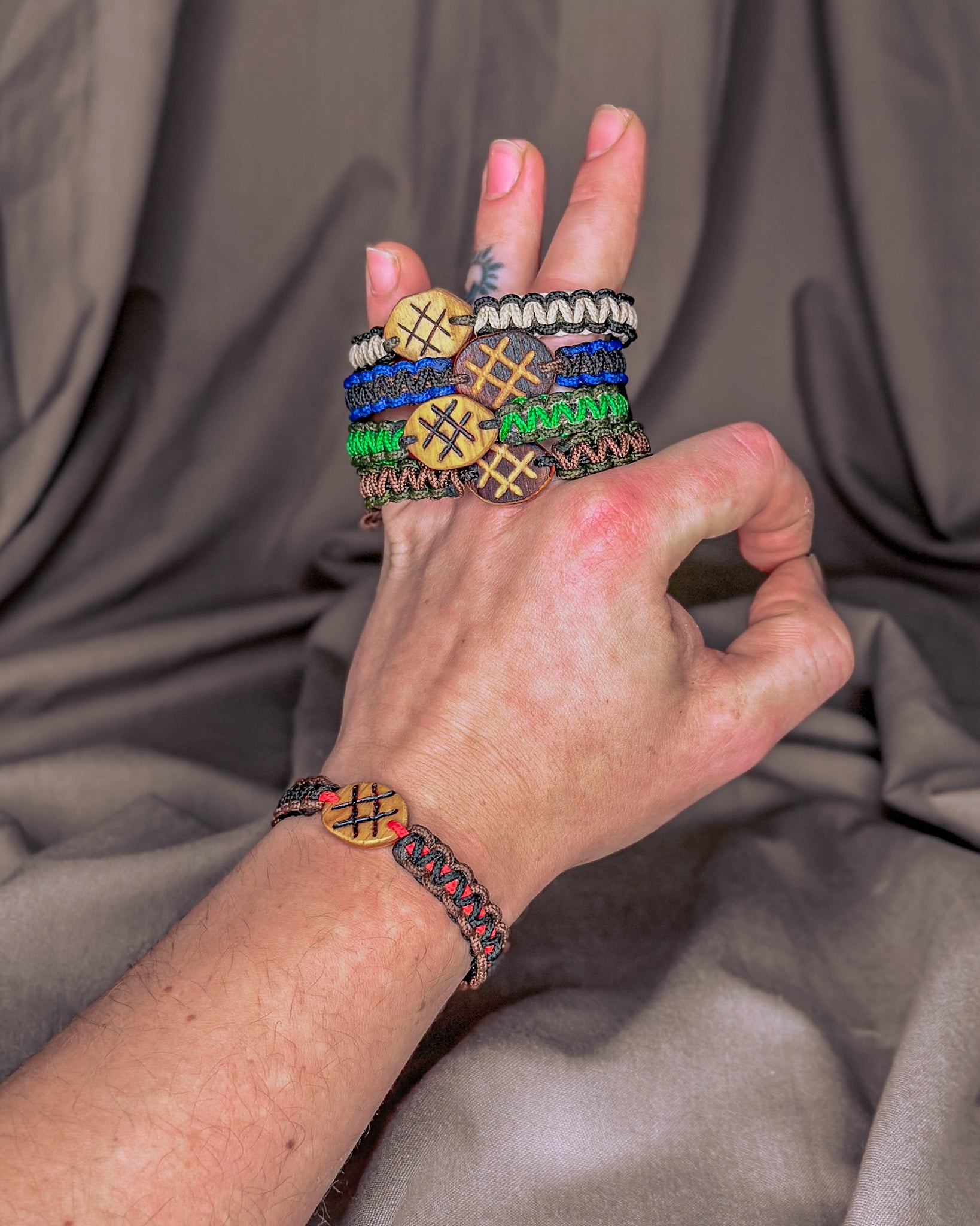 Jos nebijo nei vandens, nei kasdienio dėvėjimo. Naudojama virvė - itin tvirta, atlaikanti iki 70 kg apkrovą. Vienai apyrankei įpinu apie 1,5 m virvės, kurią prireikus galima išardyti ir panaudoti kritinėje situacijoje. Kiekviena pynė yra rankų darbo — vienintelė tokia, kaip ir žmogus, kuris ją nešios. Užsidėjus, jos tampa Tavo dalimi — tyliai saugančiu ir lydinčiu talismanu daugybei metų į priekį.