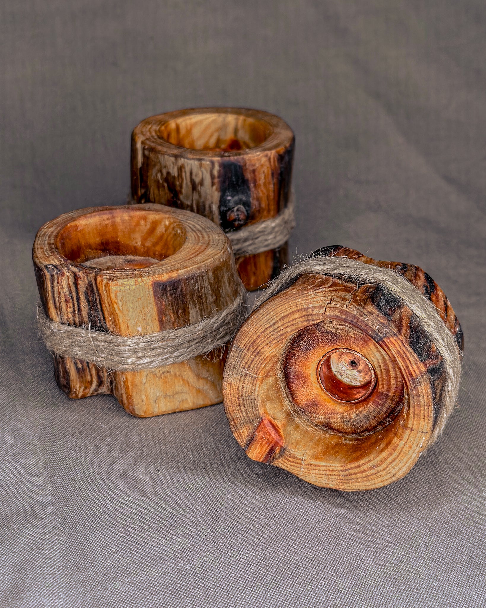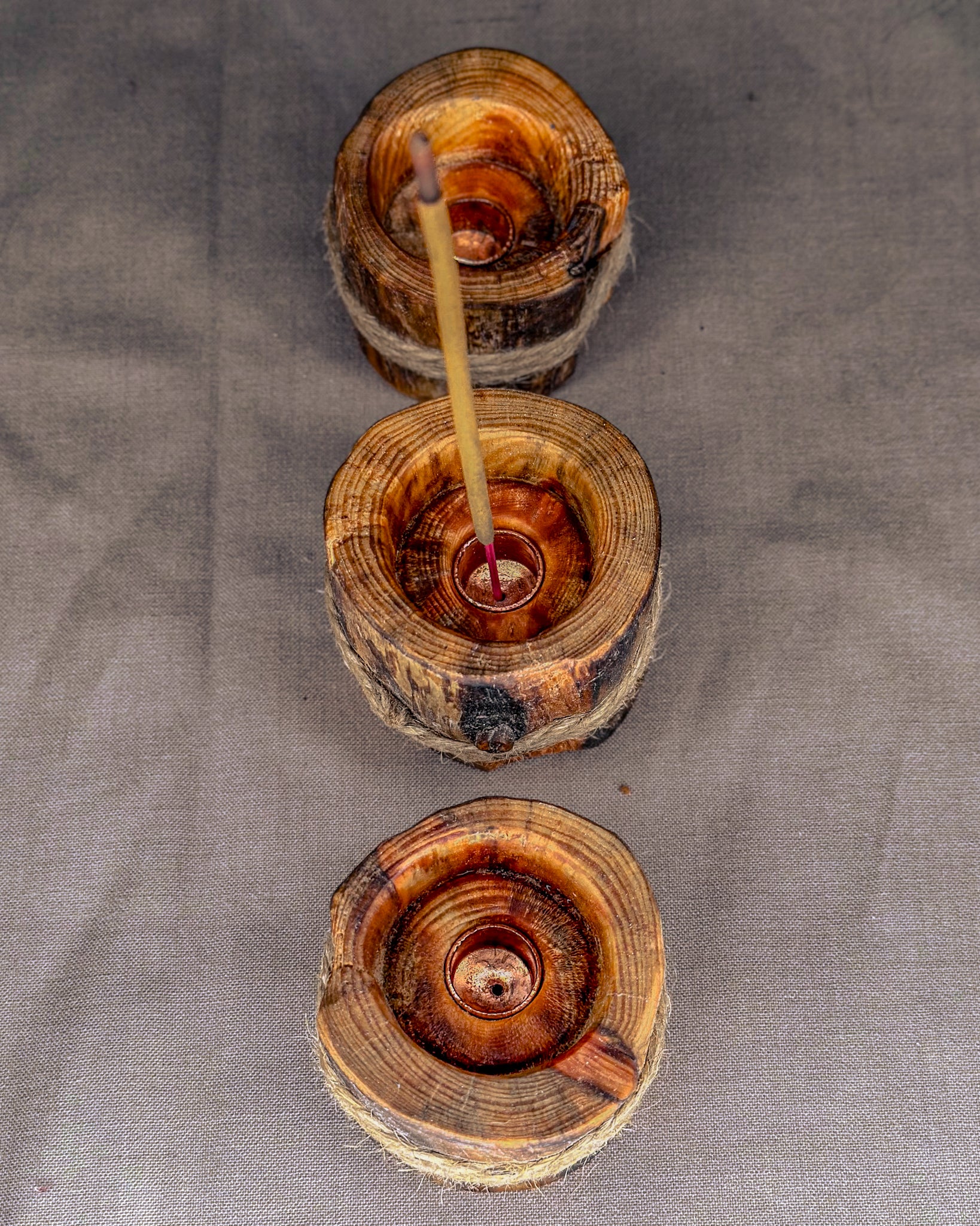 Mediena pjaunama, šlifuojama keliais etapais, leidžiant jai pačiai „atsiverti“ proceso metu, todėl du visiškai vienodi gaminiai tiesiog neegzistuoja. Vėliau paviršius tepamas linų sėmenų aliejumi, kuris išryškina medžio raštą, ir dengiamas matiniu laku, saugančiu nuo aplinkos poveikio. Įmontuota metalinė detalė leidžia saugiai ir patogiai užgesinti smilkalą. Pabaigai apvyniojama kanapinė virvė, kuri suteikia papildomo charakterio ir natūralumo pojūtį.