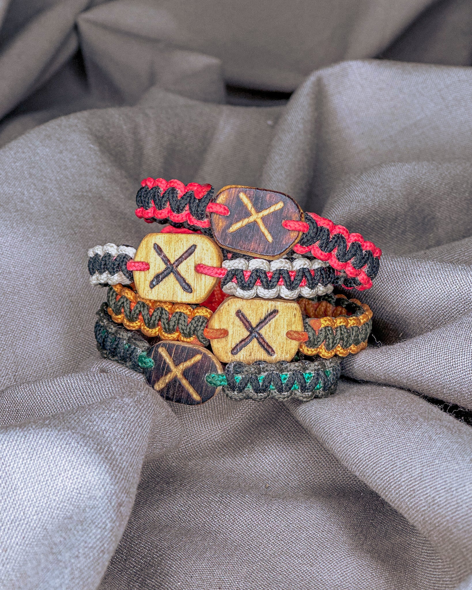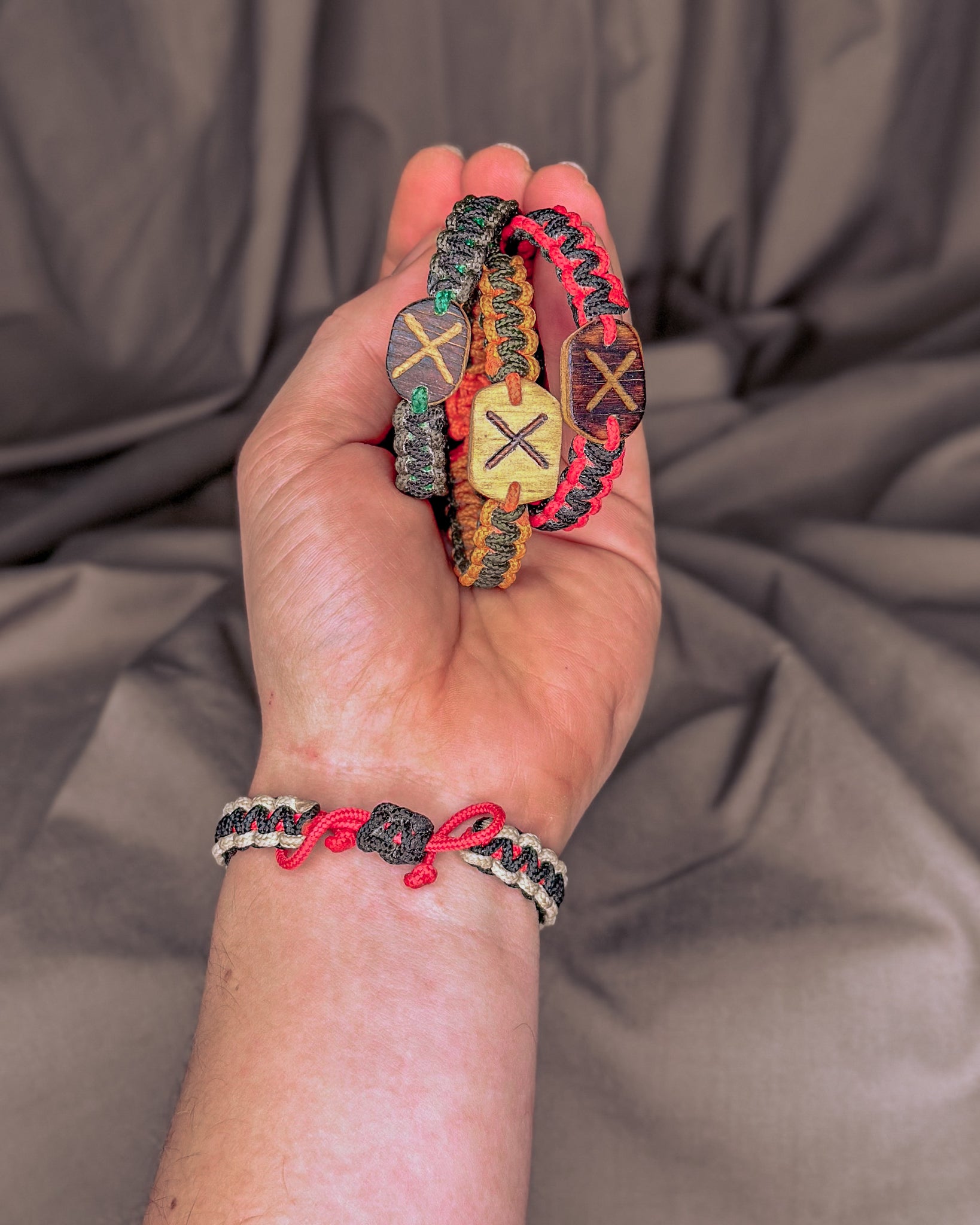 Jos nebijo nei vandens, nei kasdienio dėvėjimo. Naudojama virvė - itin tvirta, atlaikanti iki 70 kg apkrovą. Vienai apyrankei įpinu apie 1,5 m virvės, kurią prireikus galima išardyti ir panaudoti kritinėje situacijoje. Kiekviena pynė yra rankų darbo — vienintelė tokia, kaip ir žmogus, kuris ją nešios. Užsidėjus, jos tampa Tavo dalimi — tyliai saugančiu ir lydinčiu talismanu daugybei metų į priekį.