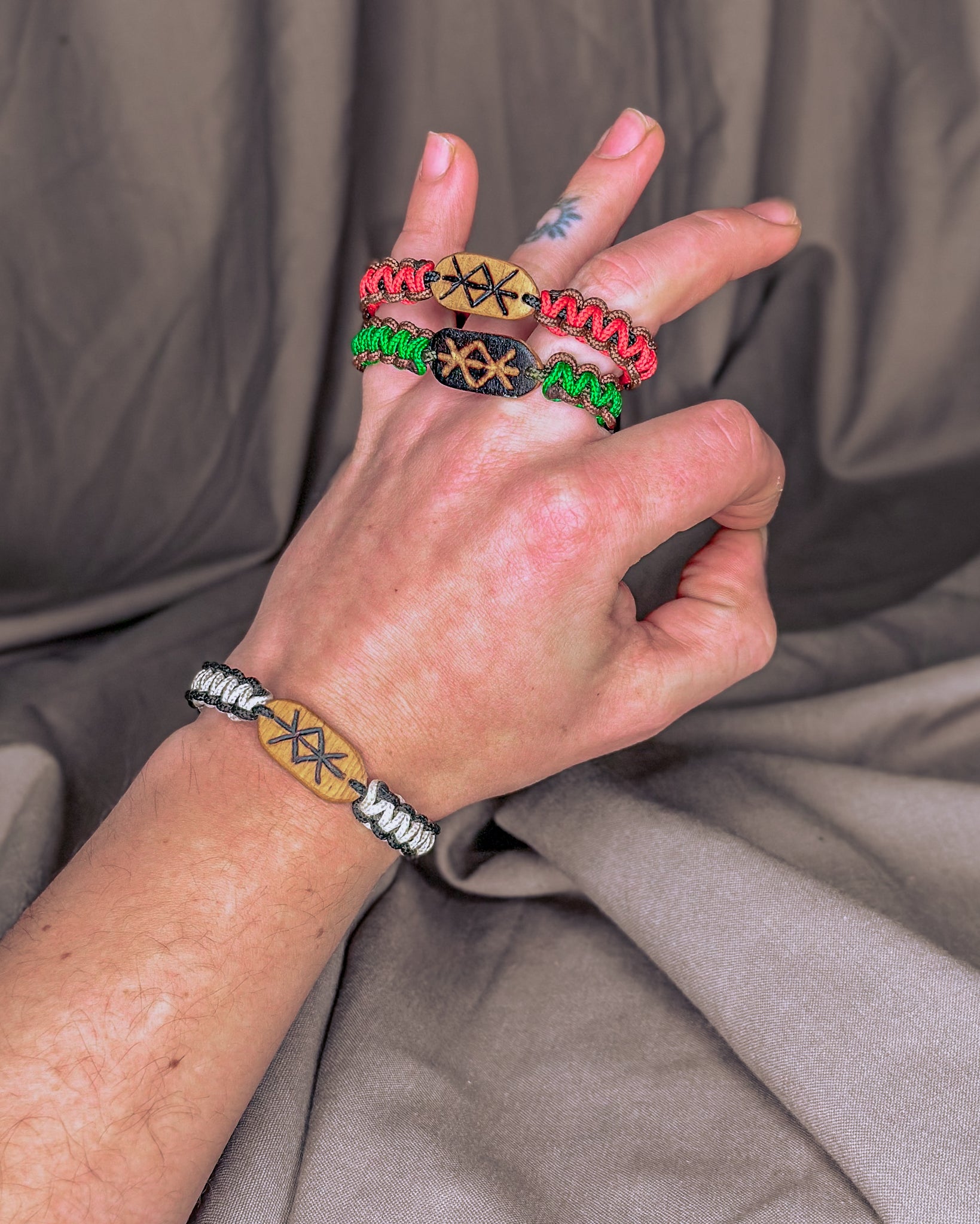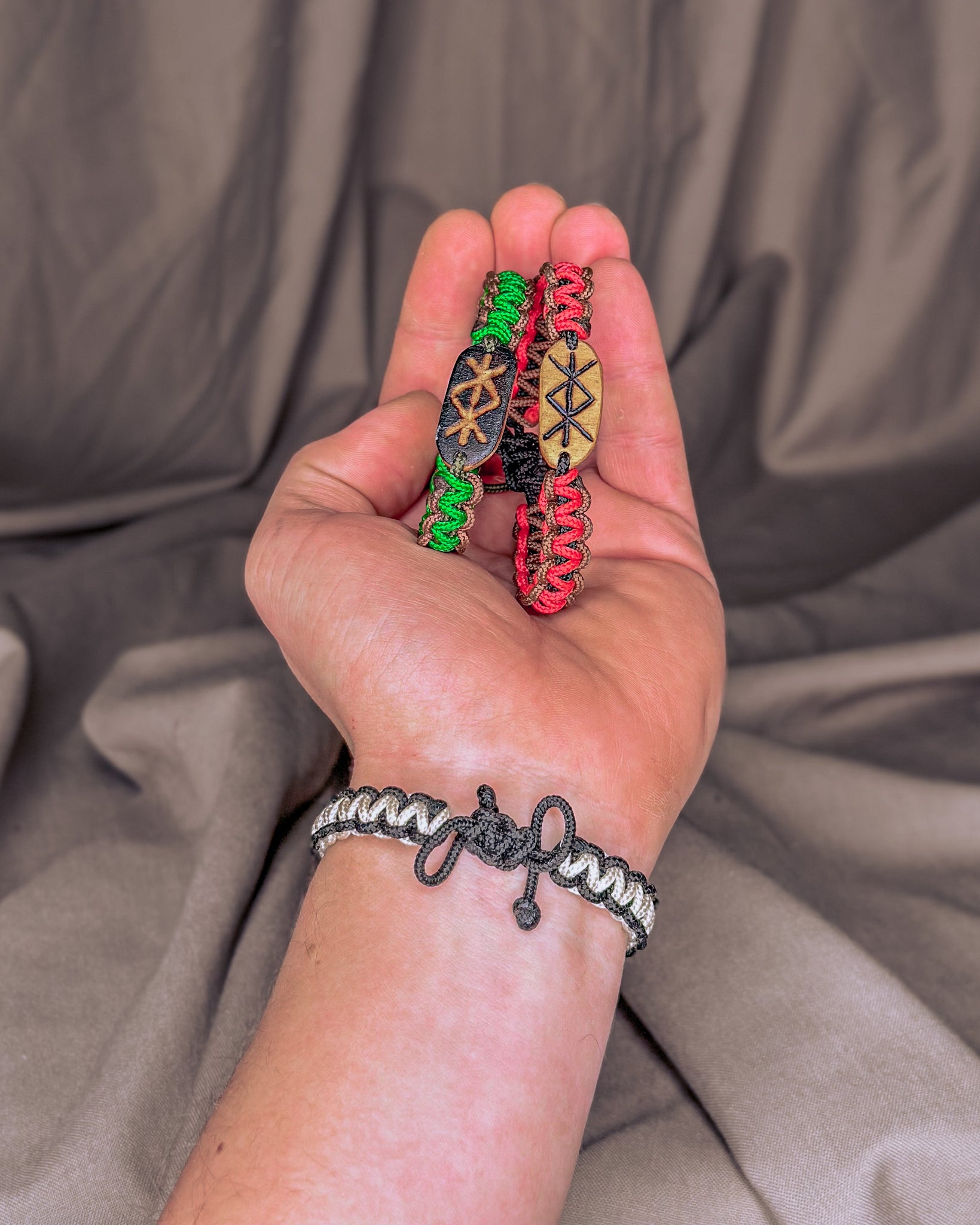 Jos nebijo nei vandens, nei kasdienio dėvėjimo. Naudojama virvė - itin tvirta, atlaikanti iki 70 kg apkrovą. Vienai apyrankei įpinu apie 1,5 m virvės, kurią prireikus galima išardyti ir panaudoti kritinėje situacijoje. Kiekviena pynė yra rankų darbo — vienintelė tokia, kaip ir žmogus, kuris ją nešios. Užsidėjus, jos tampa Tavo dalimi — tyliai saugančiu ir lydinčiu talismanu daugybei metų į priekį.