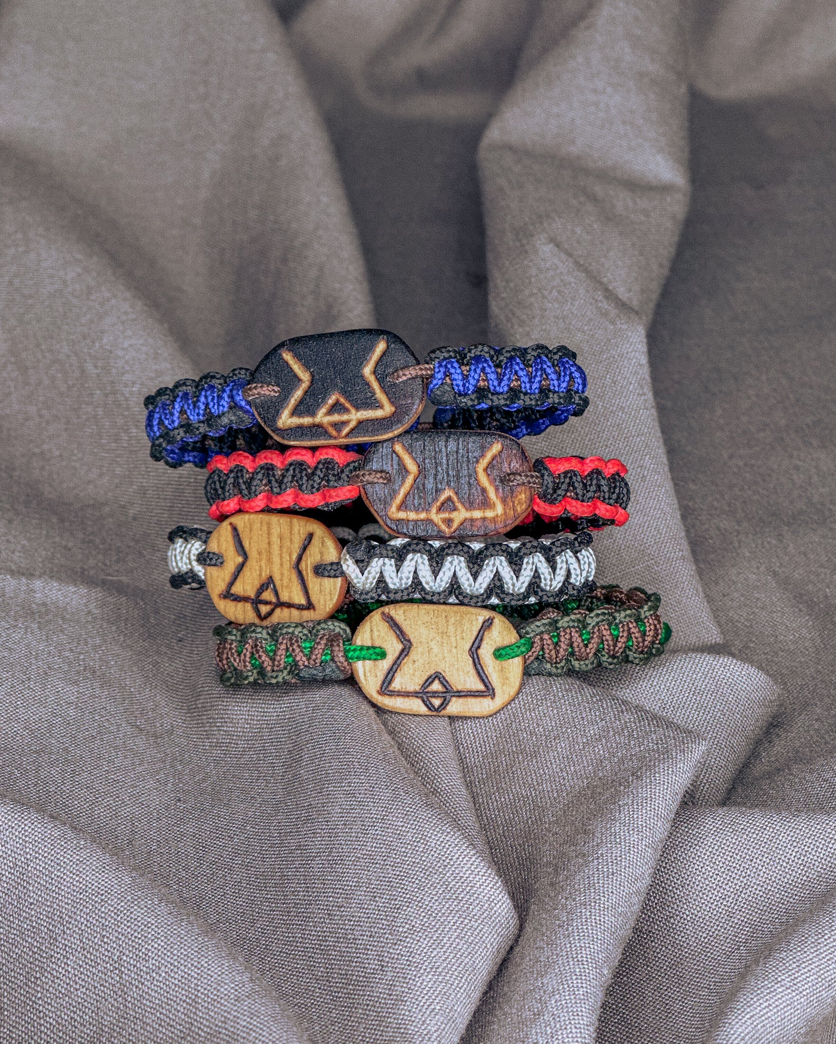 Apyrankių amuletai gaminami iš lietuviško beržo plokštės. Spalvai ir apsaugai naudojamas linų sėmenų aliejus bei matinis lakas. Virvė — poliamido ir medvilnės mišinys. Kiekviena spalvų kombinacija yra unikali ir gali šiek tiek skirtis nuo nuotraukos.